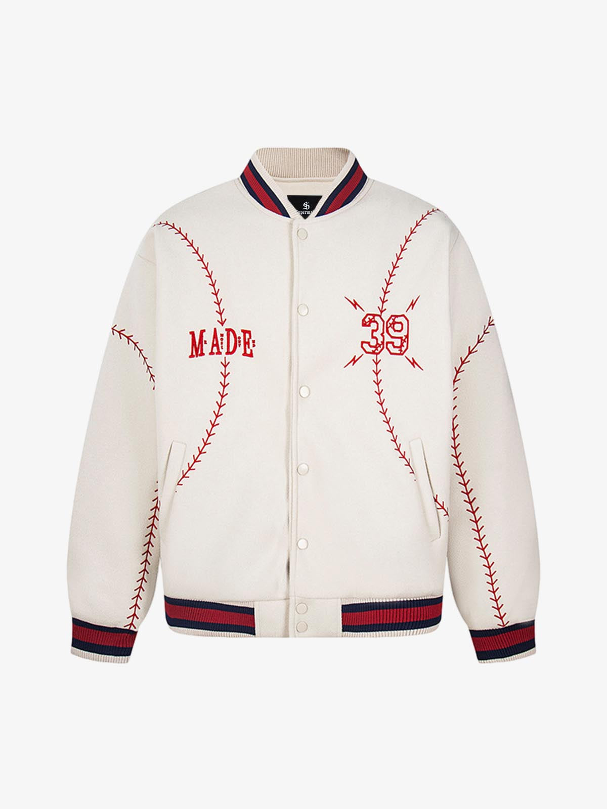 • Design Elements: Embroidered Graphic Motifs, Contrast Stitching, Varsity-Inspired Trims