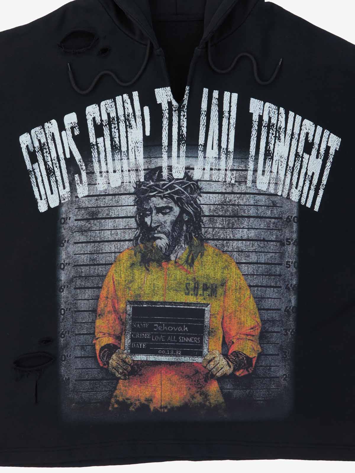 Constructed from mid-weight French terry with a vintage mineral wash, the hoodie features a provocative double-layer-inspired graphic and a raw-edge finish. This piece is defined by its intentional distressed detailing and a bold "God's Goin' To Jail Tonight" screen print. The sleeveless design and frayed hems lend it a rugged, subversive edge.