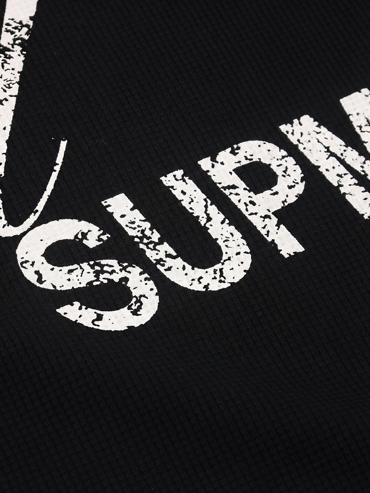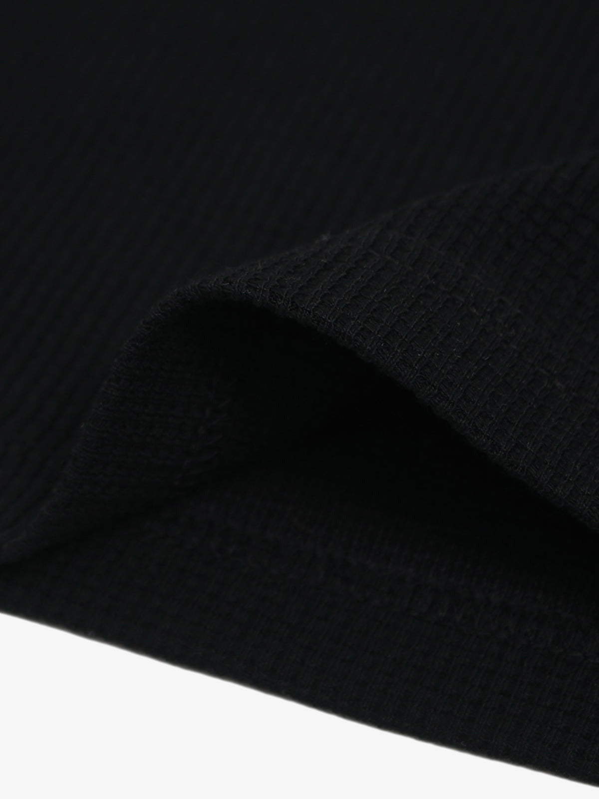 Crafted from textured waffle knit fabric, this short sleeve T-shirt combines structure and depth with bold graphic impact. The front cross and script print create a strong visual statement, while the metal studs encircling the neckline add a sharp, elevated edge. Designed to balance raw attitude with layered texture.