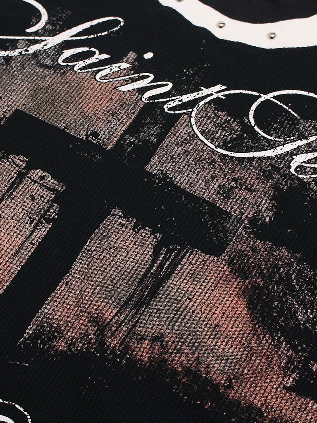 Gothic Cross Print Studded Collar Waffle Knit Graphic T-Shirt