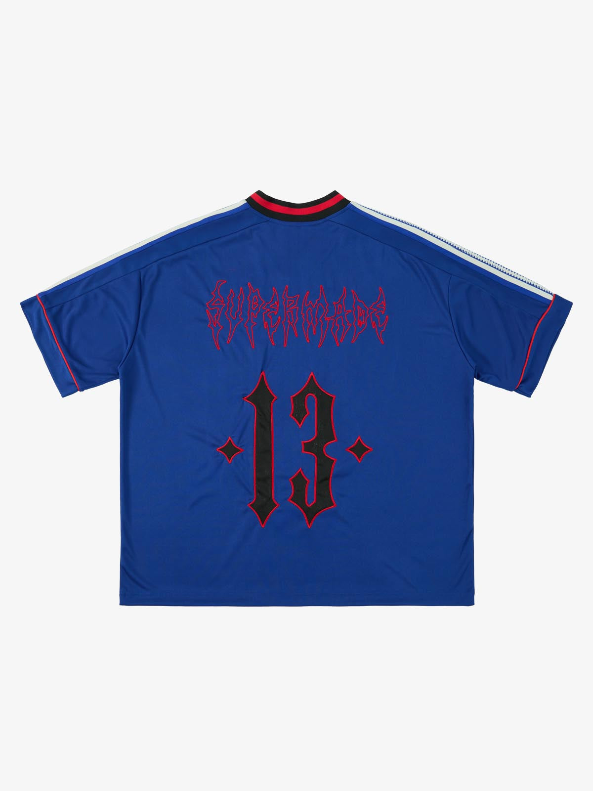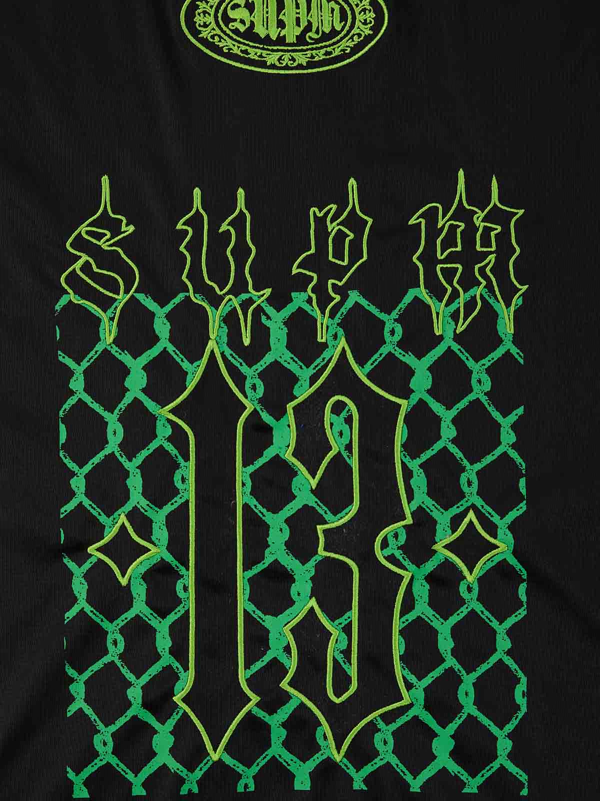 Constructed from woven polyester fabric, this jersey T-shirt channels a fusion of sportswear structure and gothic street aesthetics. The piece features oversized number graphics layered over mesh panel visuals, paired with gothic typography and embroidered detailing for added texture and dimension. Contrast piping and a ribbed V-neck collar enhance the athletic silhouette, delivering a statement look built for both street styling and casual wear.