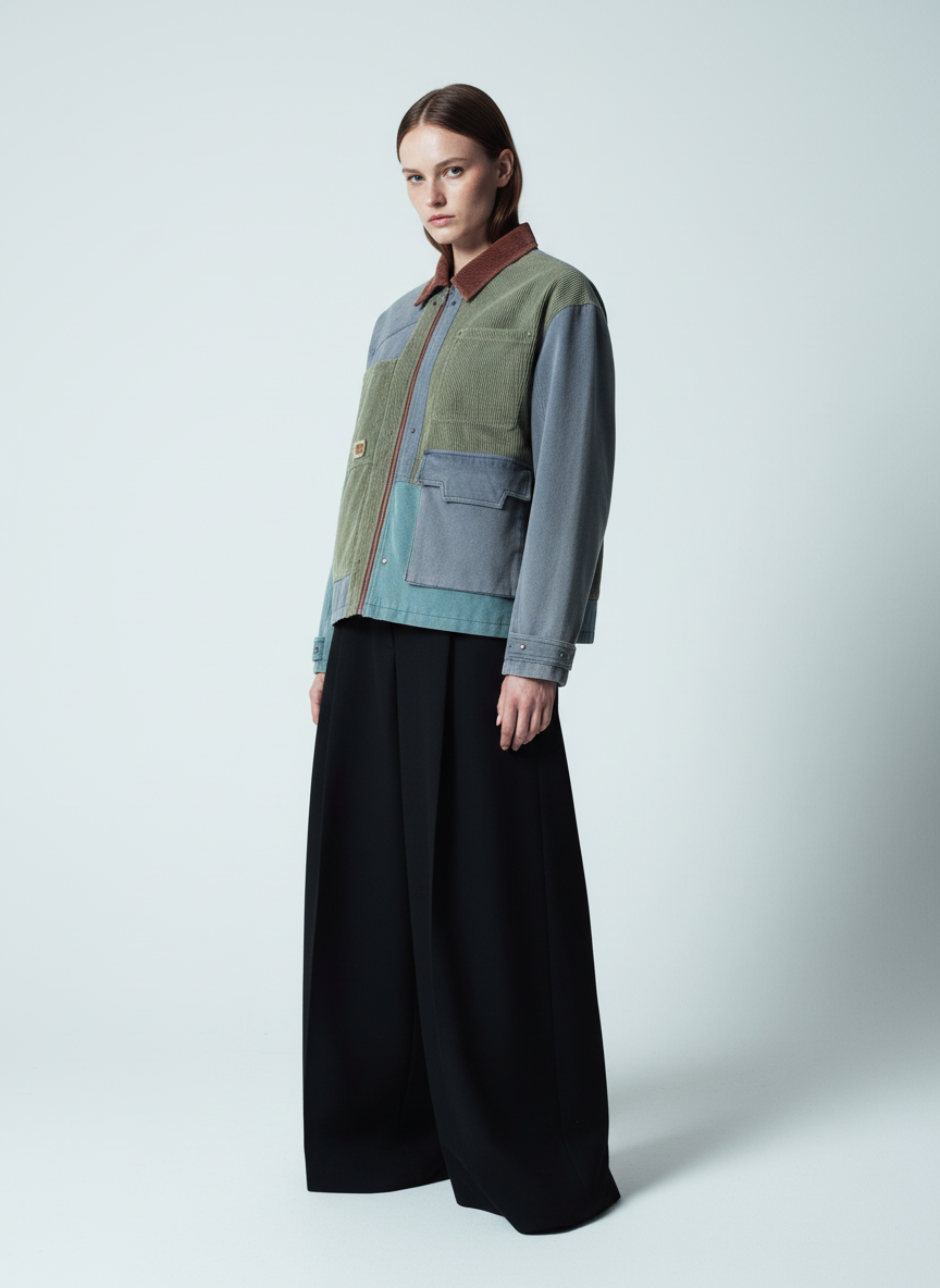 • Design Elements: Contrasting color blocks, corduroy accents, front zipper closure