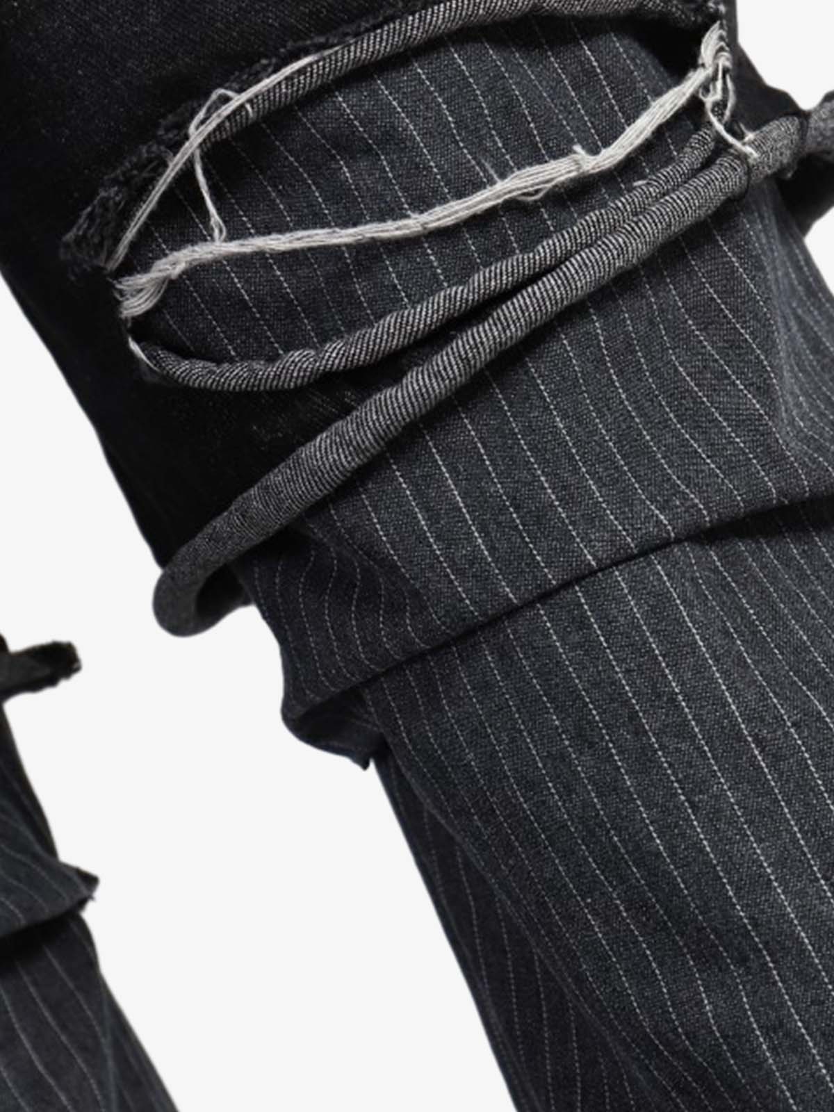 These statement denim jeans feature a bold layered construction that combines distressed denim shorts with stacked flared pant legs. The ripped black denim upper adds a rugged streetwear edge, while the striped layered panels create dramatic volume and movement. Designed to stand out, this hybrid silhouette blends deconstructed style with expressive street fashion.