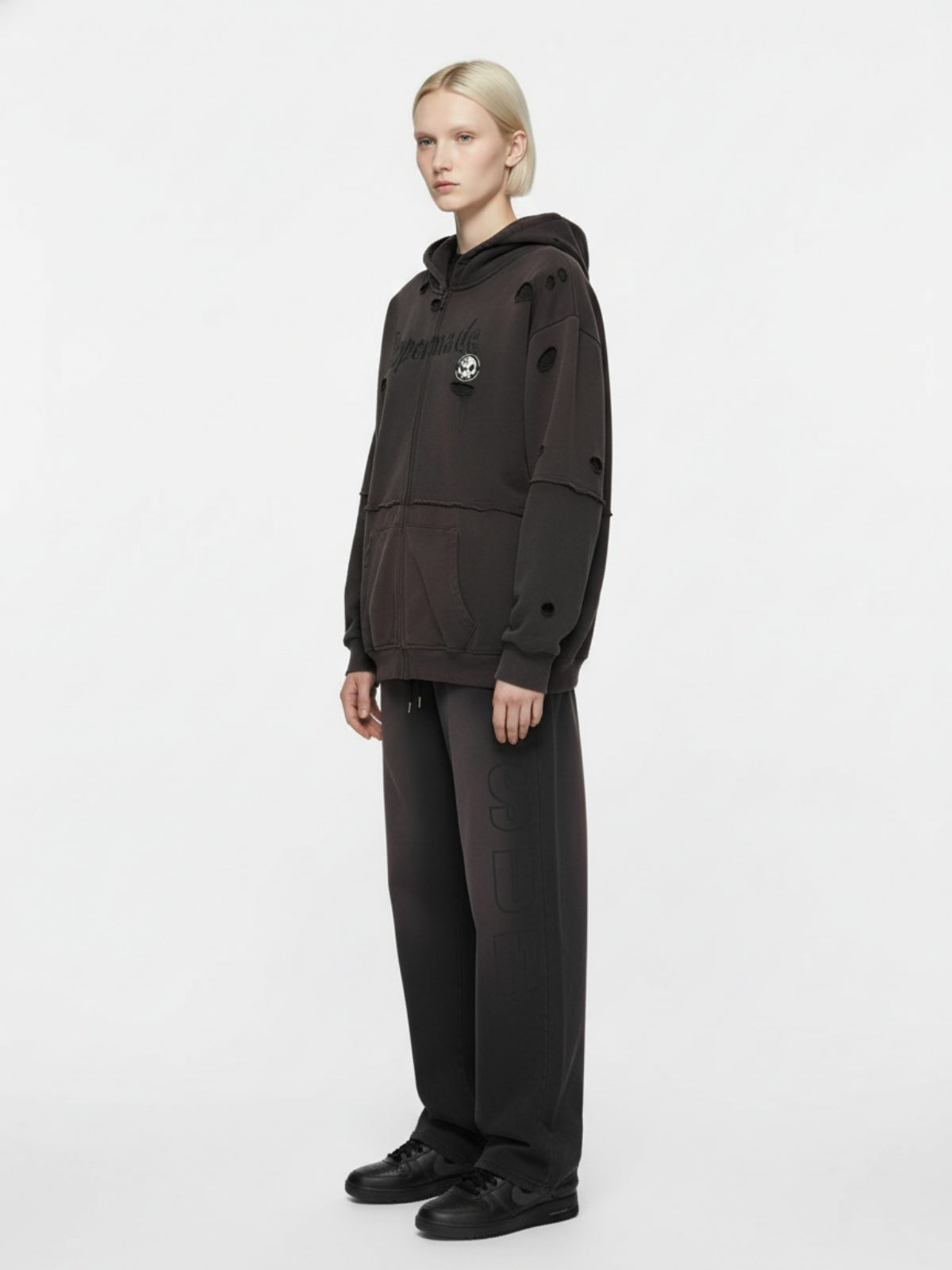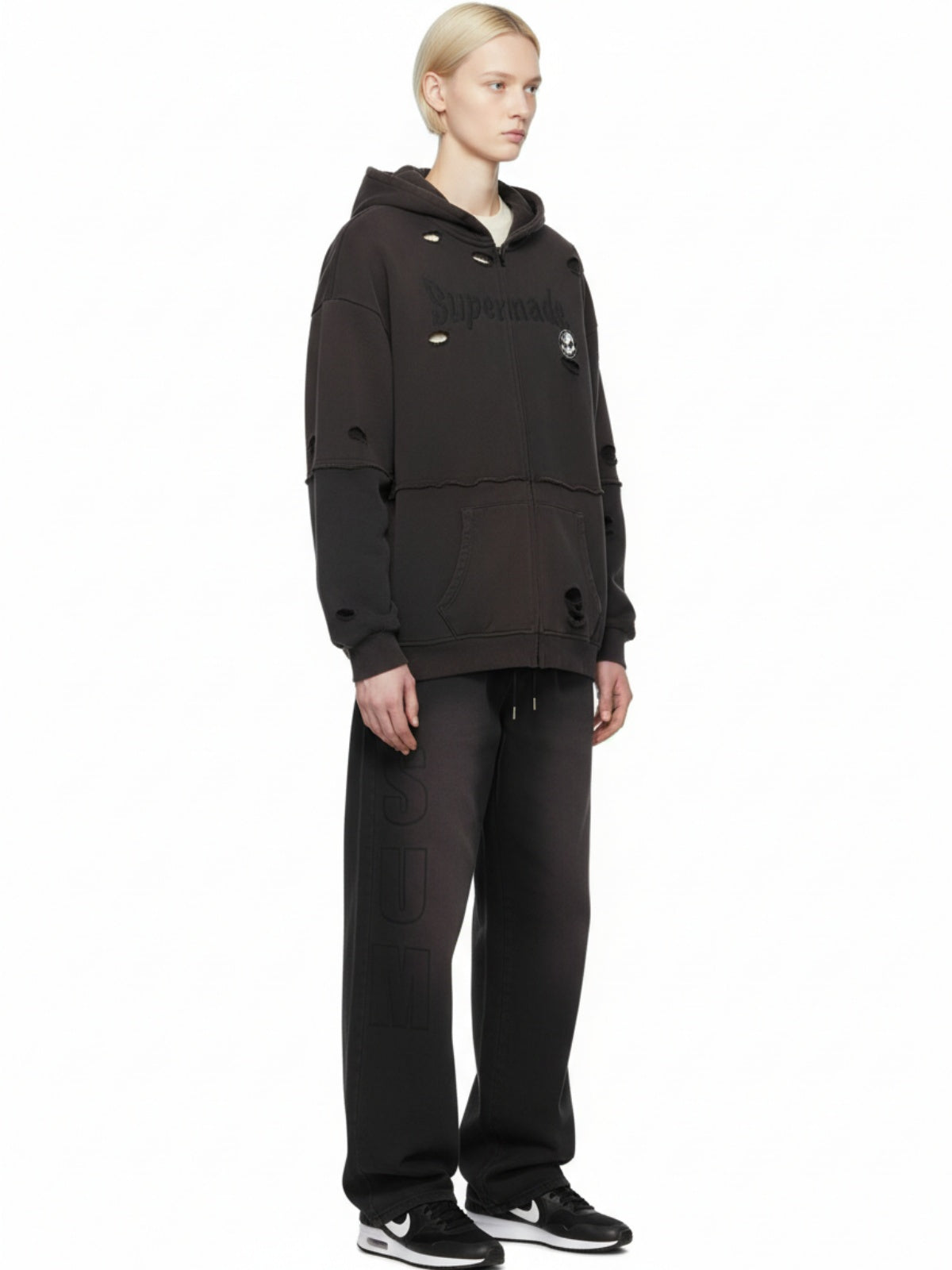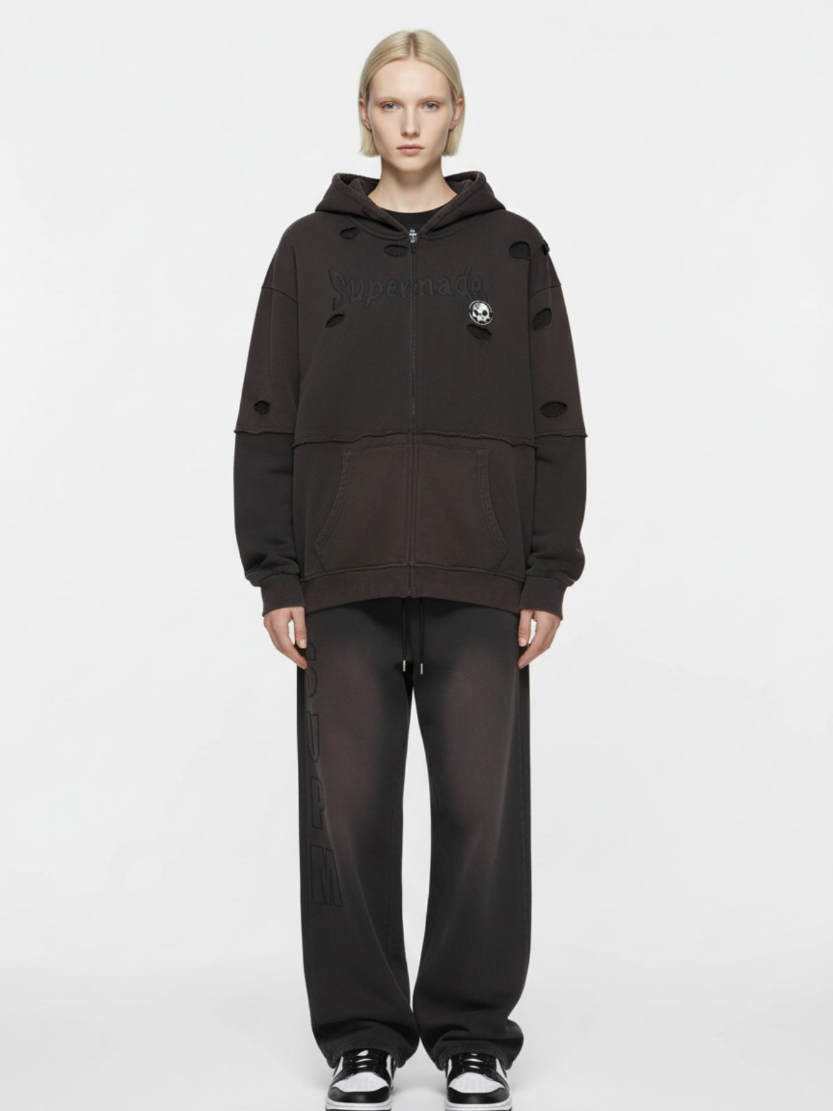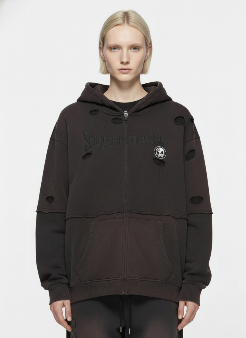 • Design Elements: Vintage washed effect, ripped details, skull graphic, cotton hoodie + cardigan two-piece set