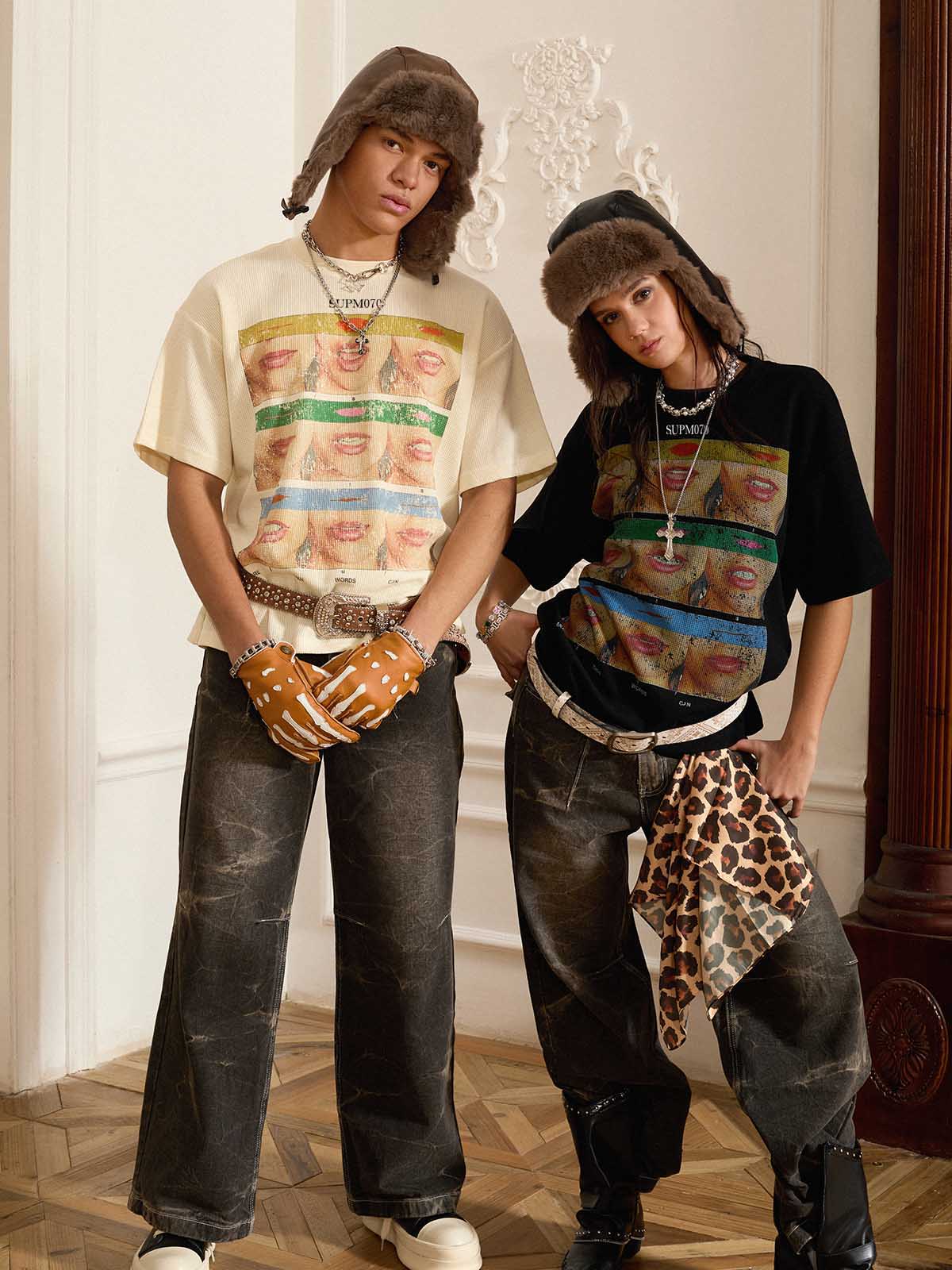 • Detail Features: Three Horizontal Panels of Artistic Face Print, Front Text Logo "SUPM070"