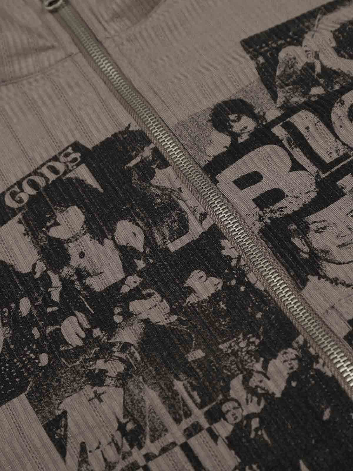 • Details: Front Zip Closure, High Neckline, Long Sleeves, Central Graphic Panel with Vintage-Style Imagery and Text