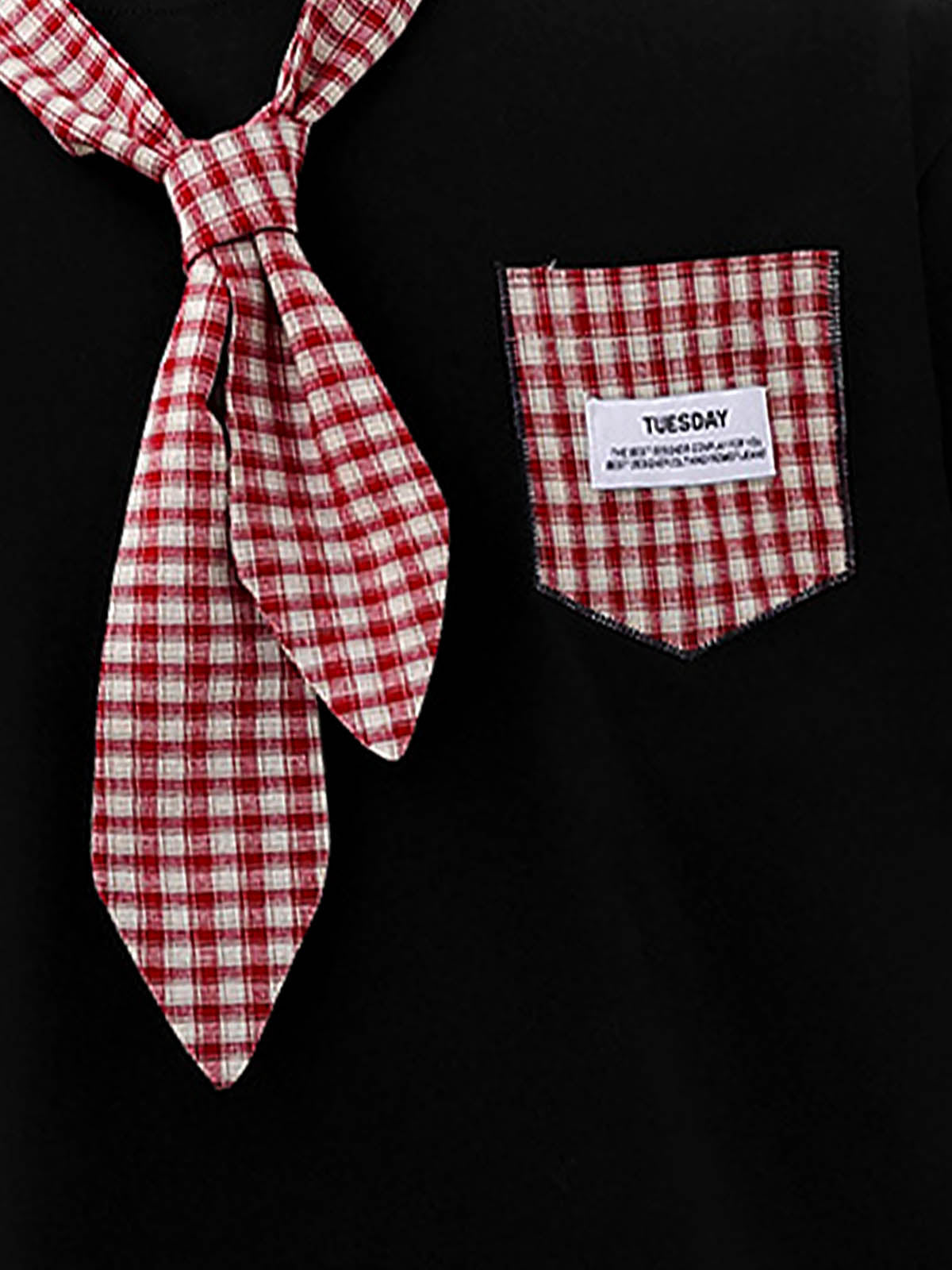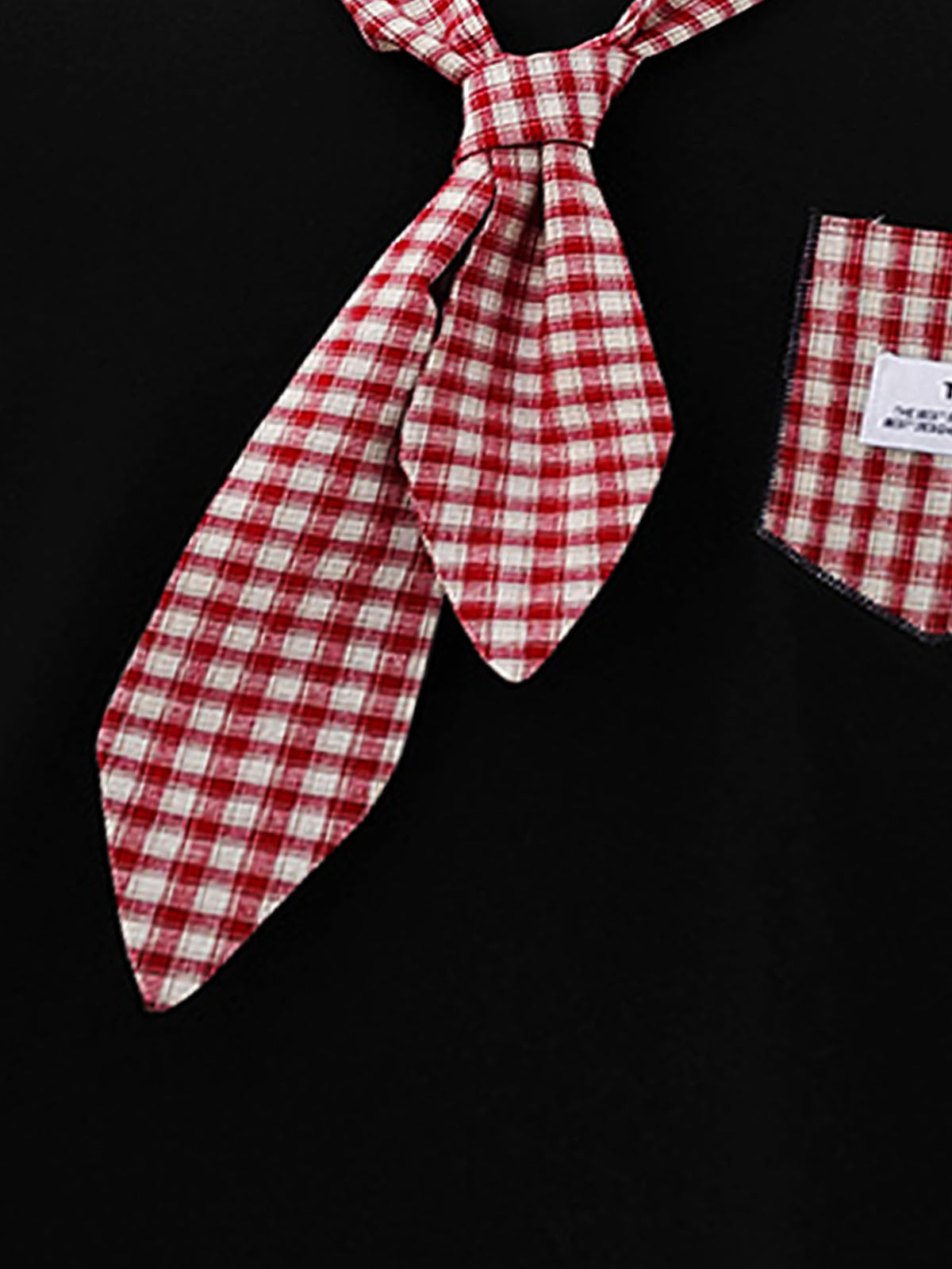 • Design Elements: Plaid tie detail, chest pocket with label, relaxed fit