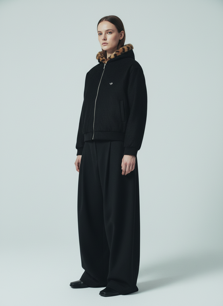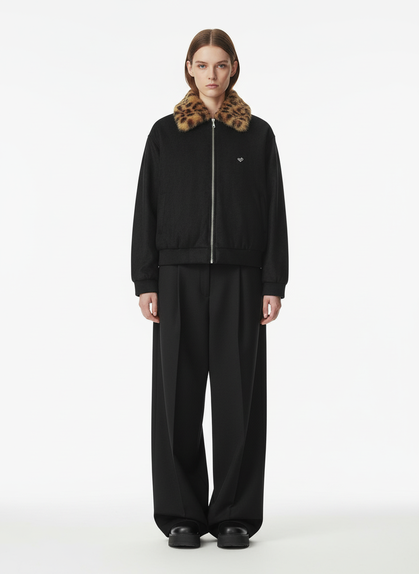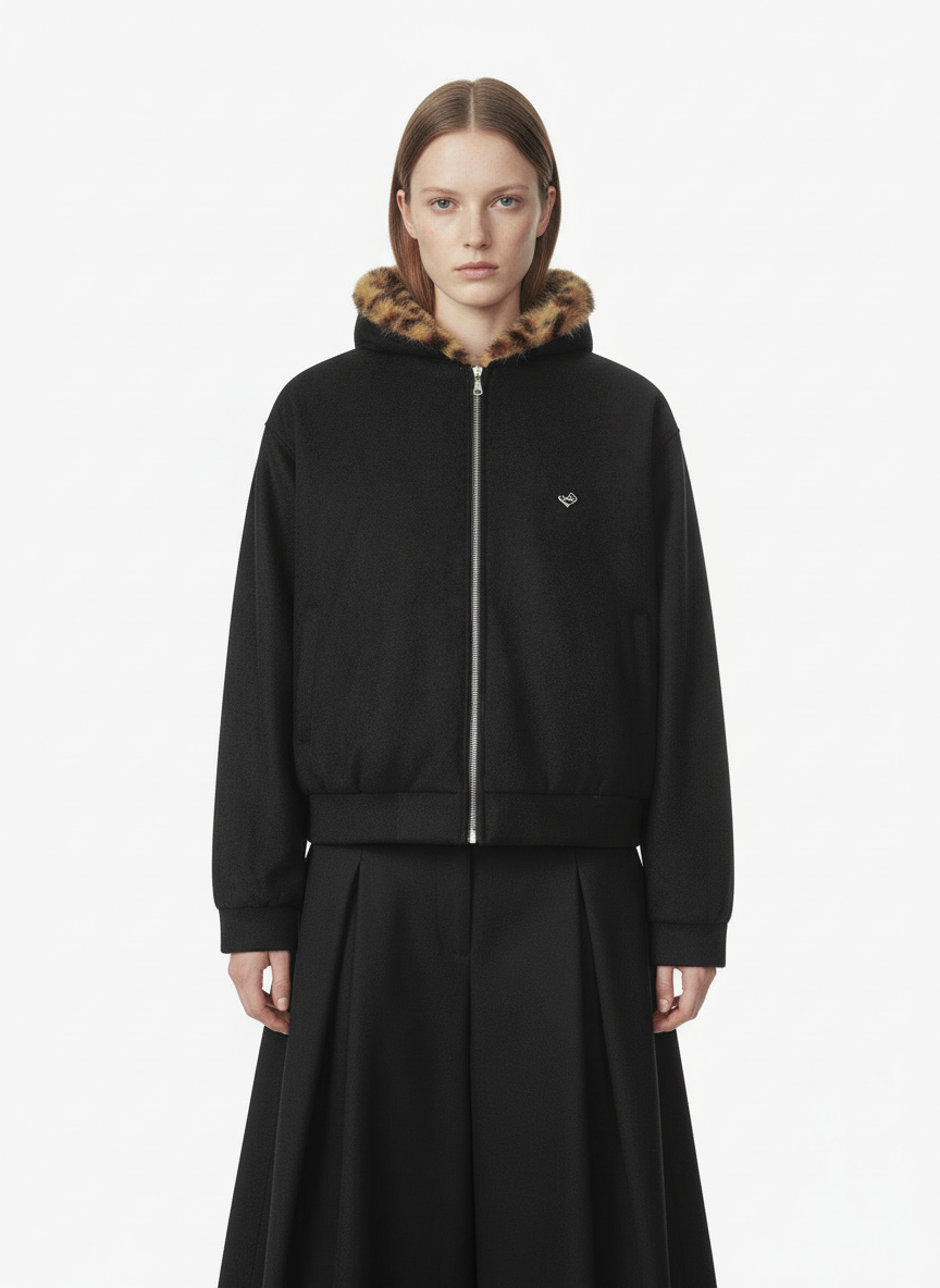 • Design Elements: Leopard print faux fur trim on hood and collar, unique cat ear design on hood, subtle heart embroidery on sleeve