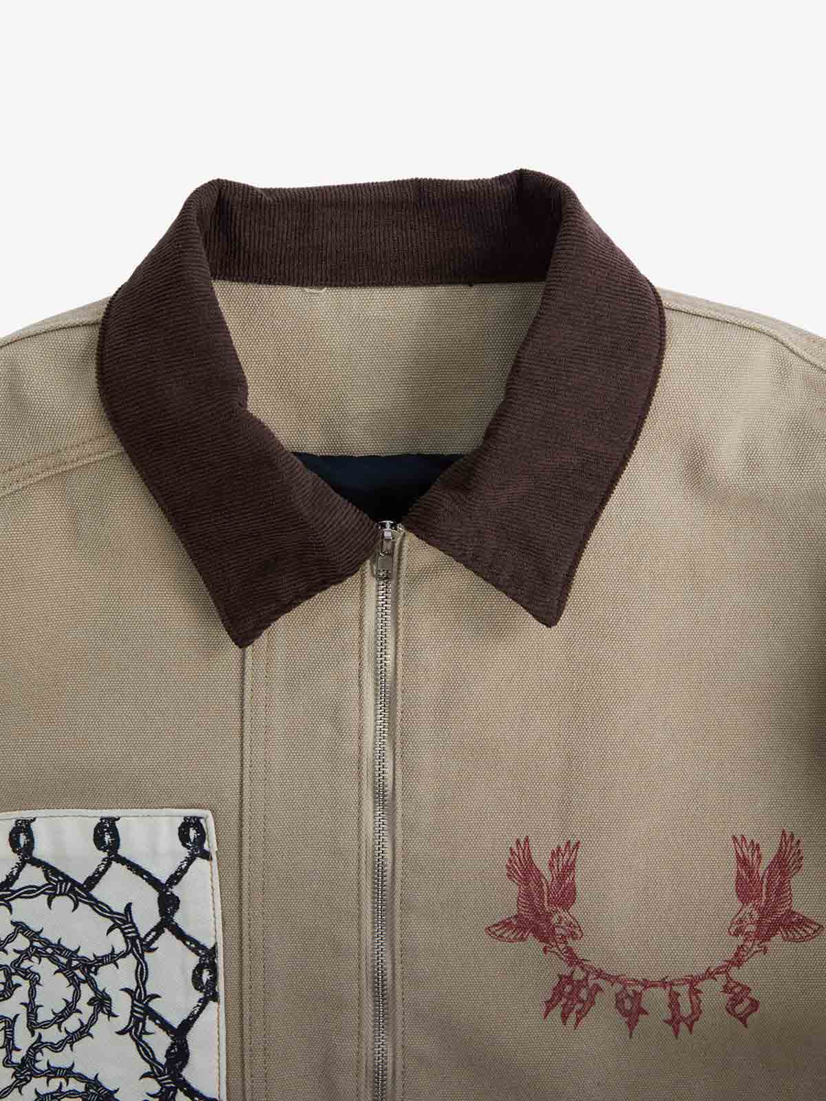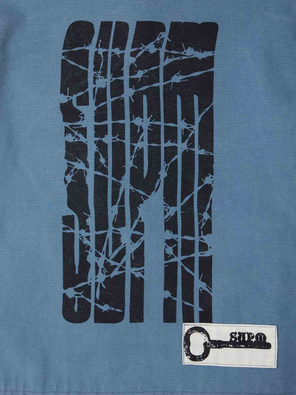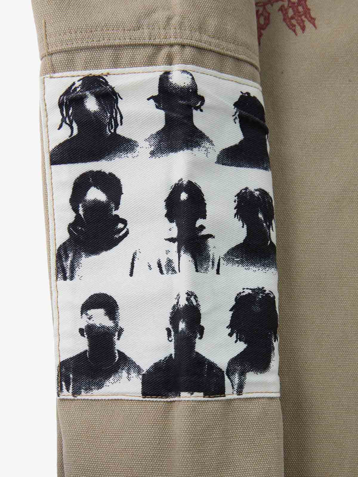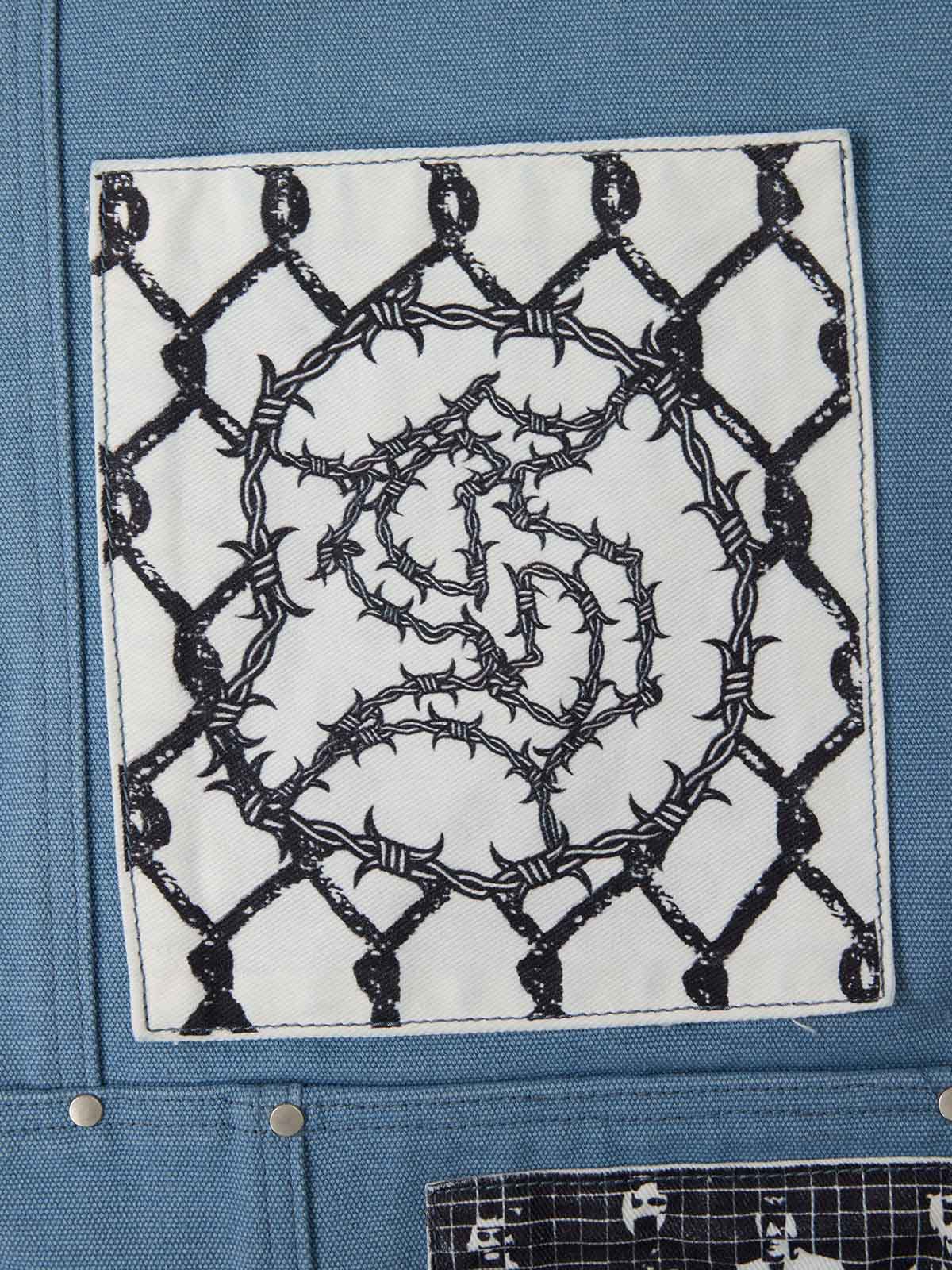 Constructed from a cotton-blend base, this denim suit merges multiple fabric textures with heavy visual detailing. The jacket features contrast corduroy paneling paired with washed denim, delivering a structured yet street-ready silhouette. Finished with multi-element appliqué patches, graphic prints, and mixed placement artwork across both the jacket and shorts, the set leans into a bold, statement-driven aesthetic while maintaining everyday wearability.