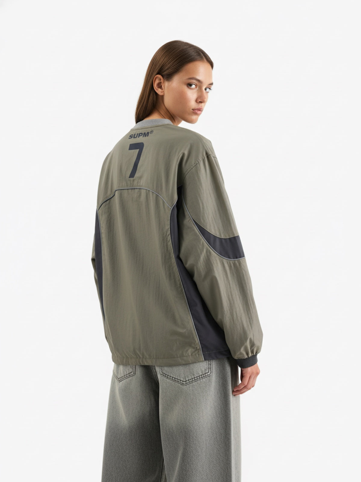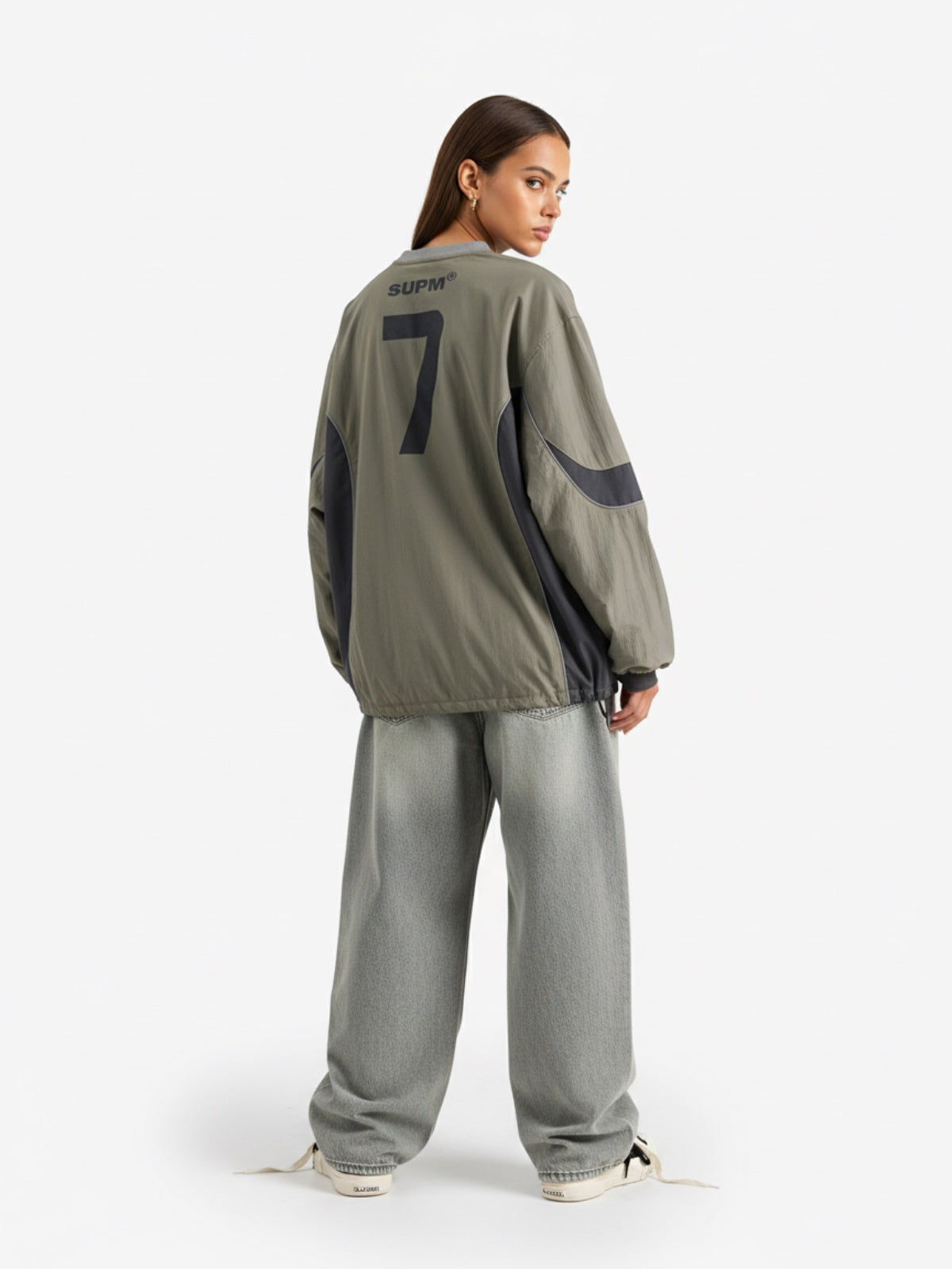 • Design Elements: Contrasting sleeve panels, bold front logo print, adjustable drawstrings at the hem