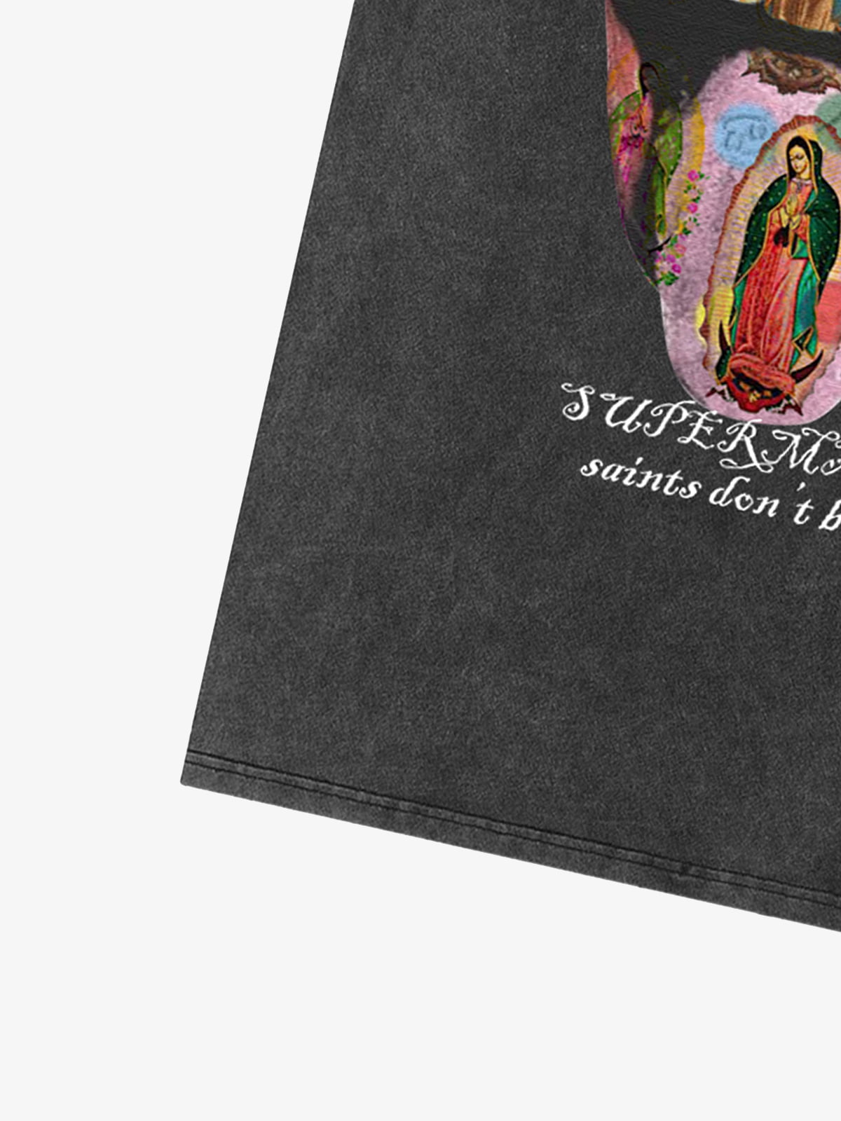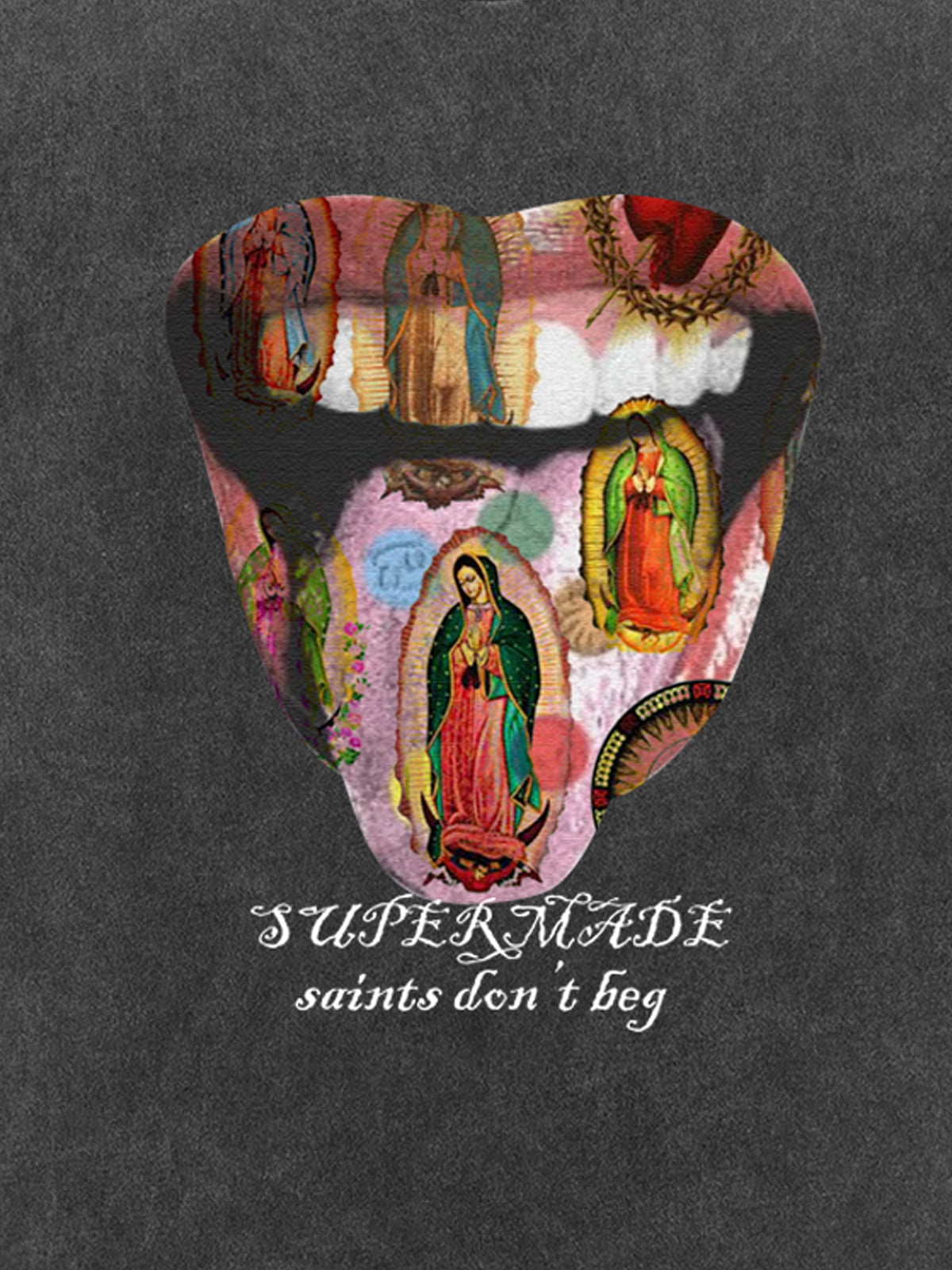 • Design Elements: Bold artistic print featuring religious iconography in a creative mouth design, text slogan below the graphic
