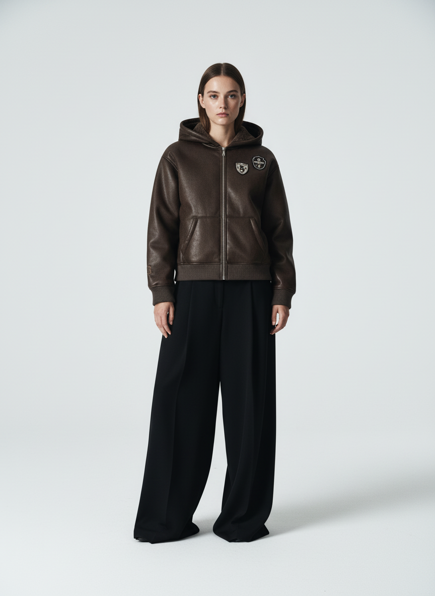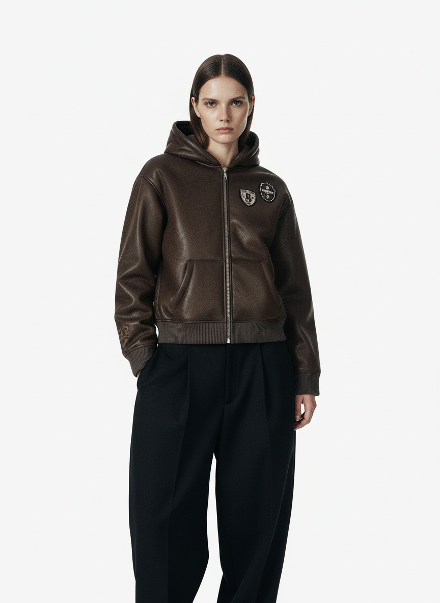 Vintage Leather Badge Fleece-lined Hooded Zip Bomber Jacket