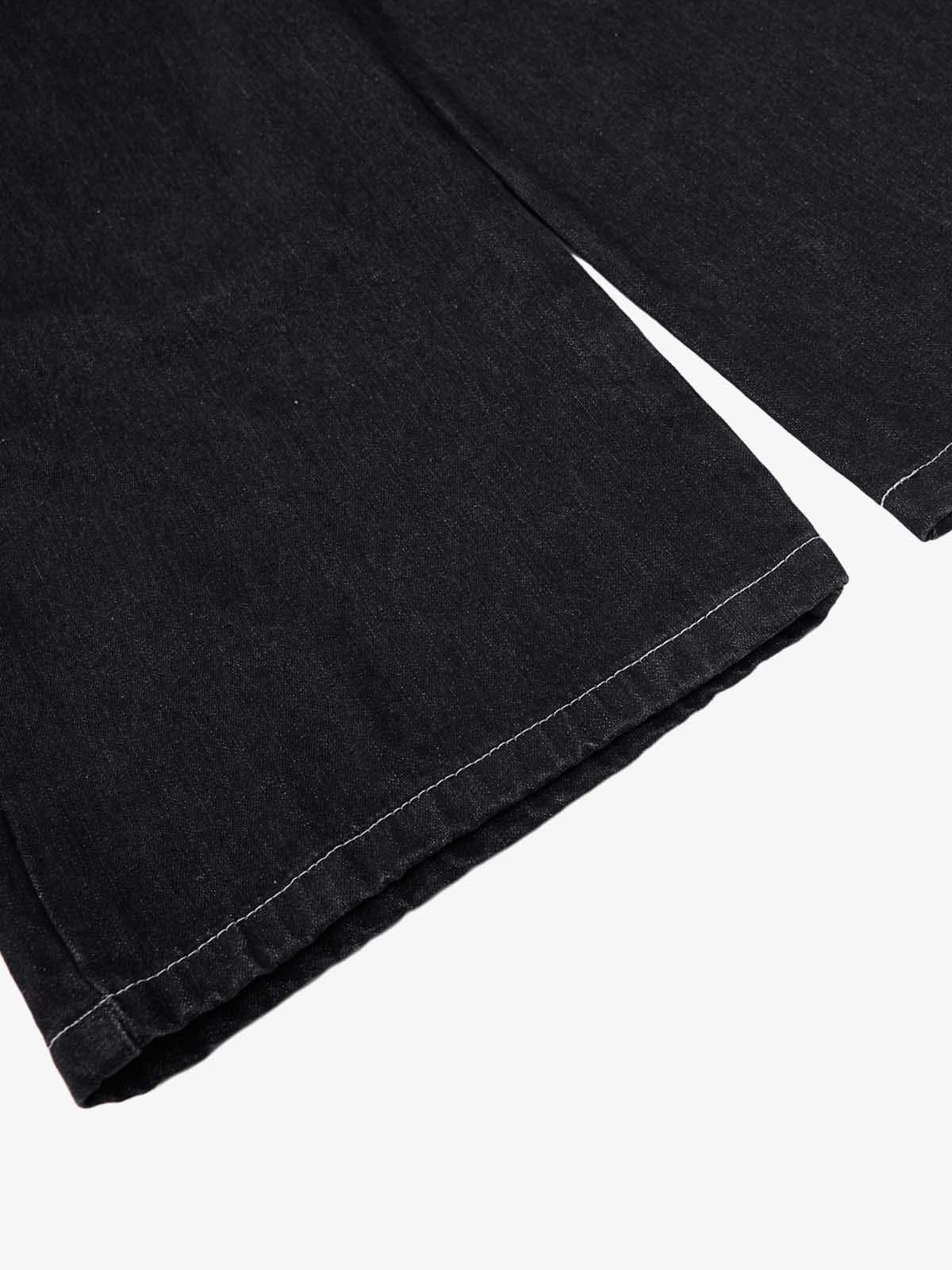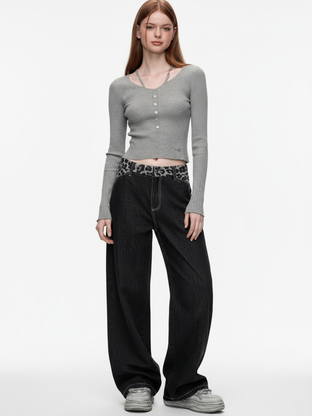 • Design Elements: Leopard print waistband, wide-leg silhouette, classic denim look
