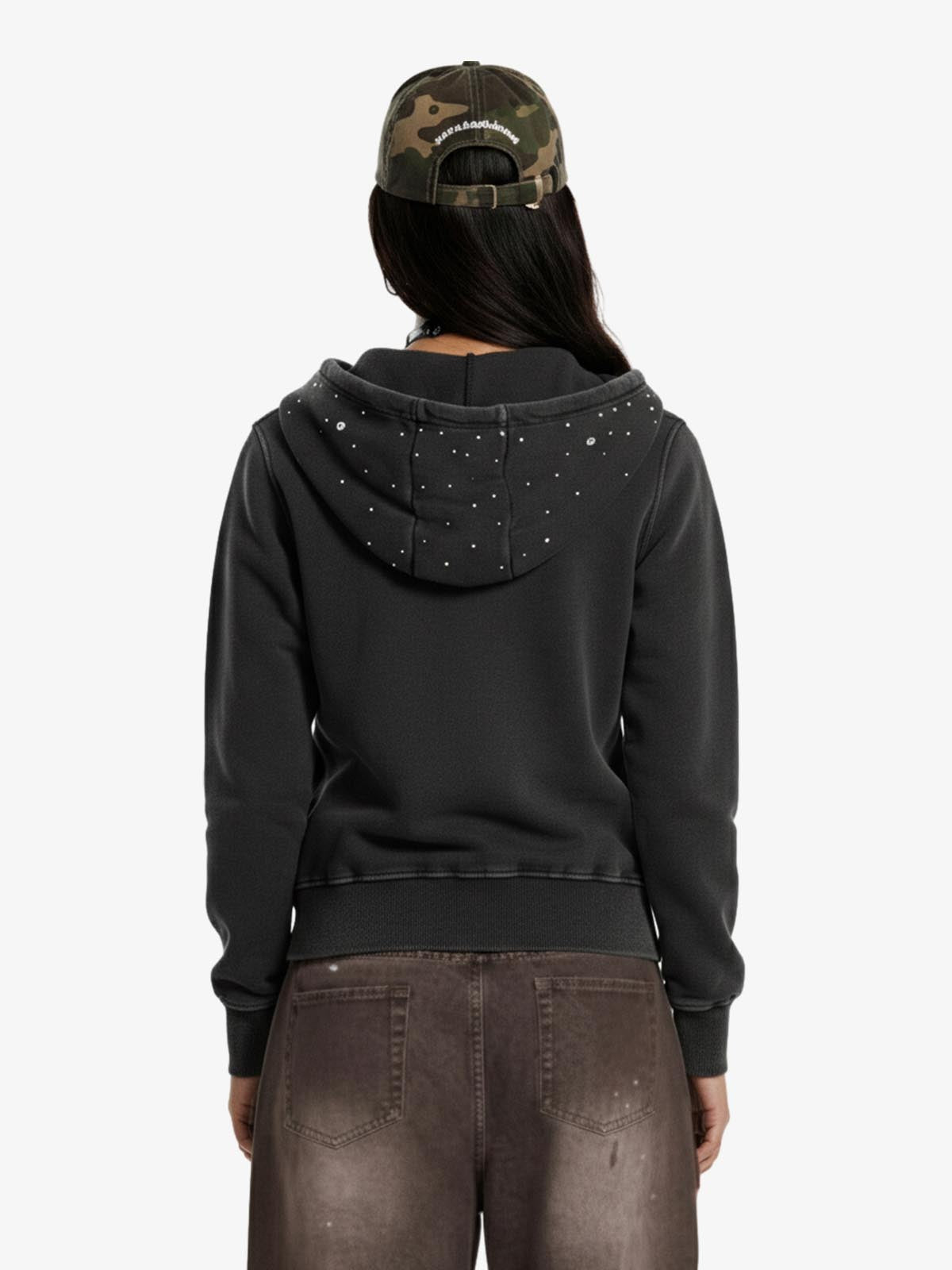 Vintage Washed Symmetrical Star Rhinestone Zip-Up Hoodie