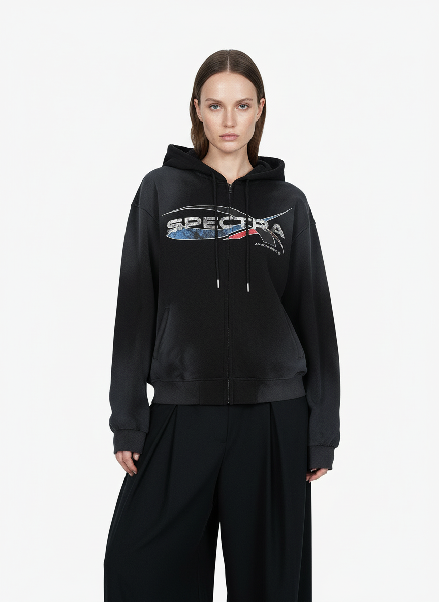 Splatter Print Faux Fur Collar Ruched Sleeve Zip-Up Jacket