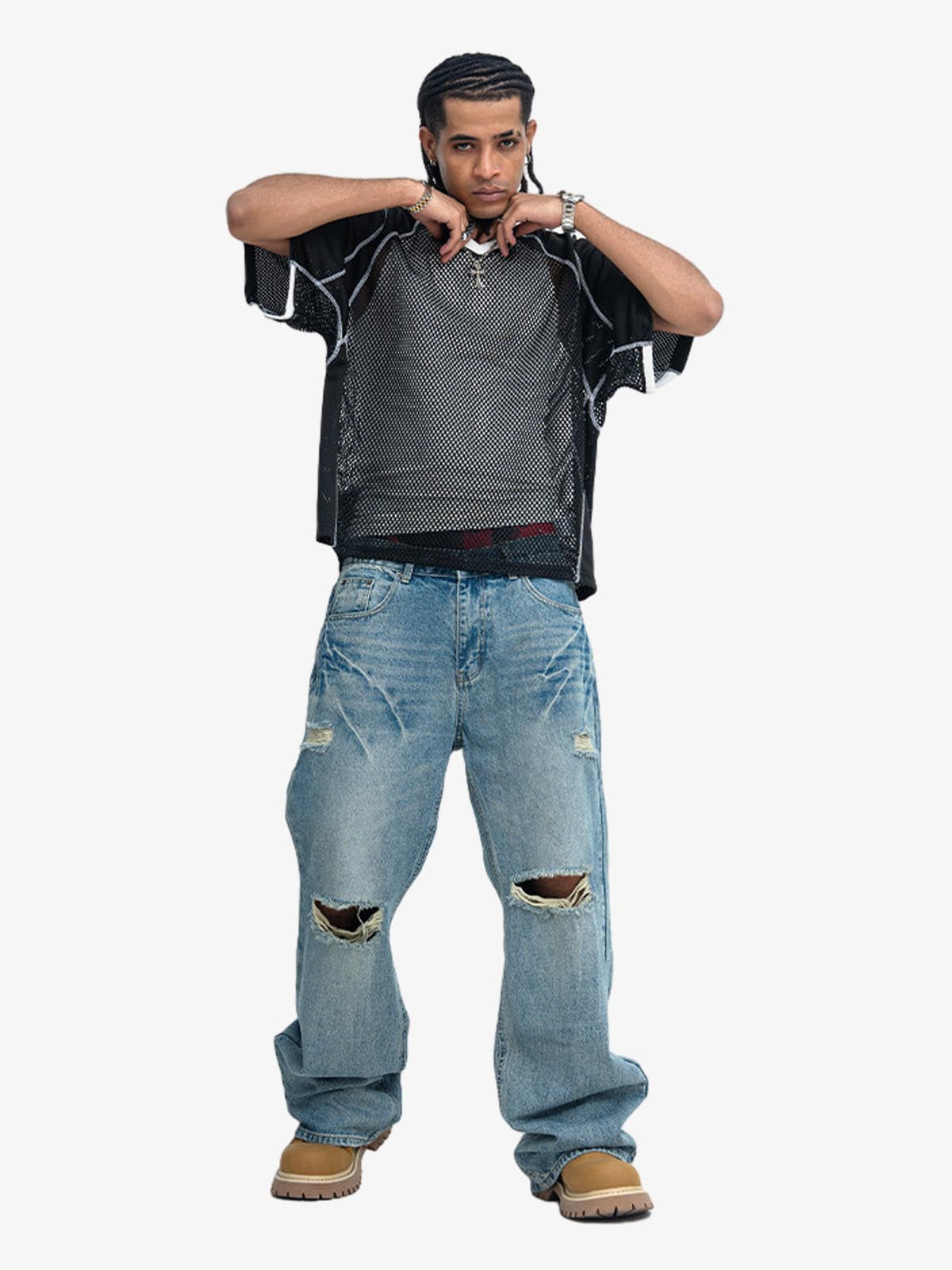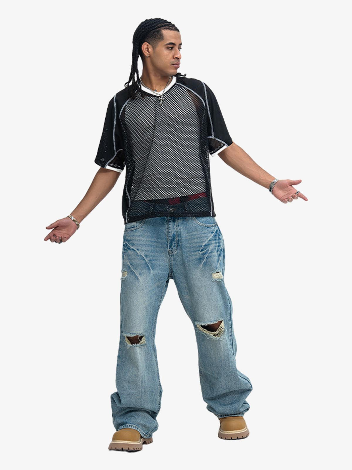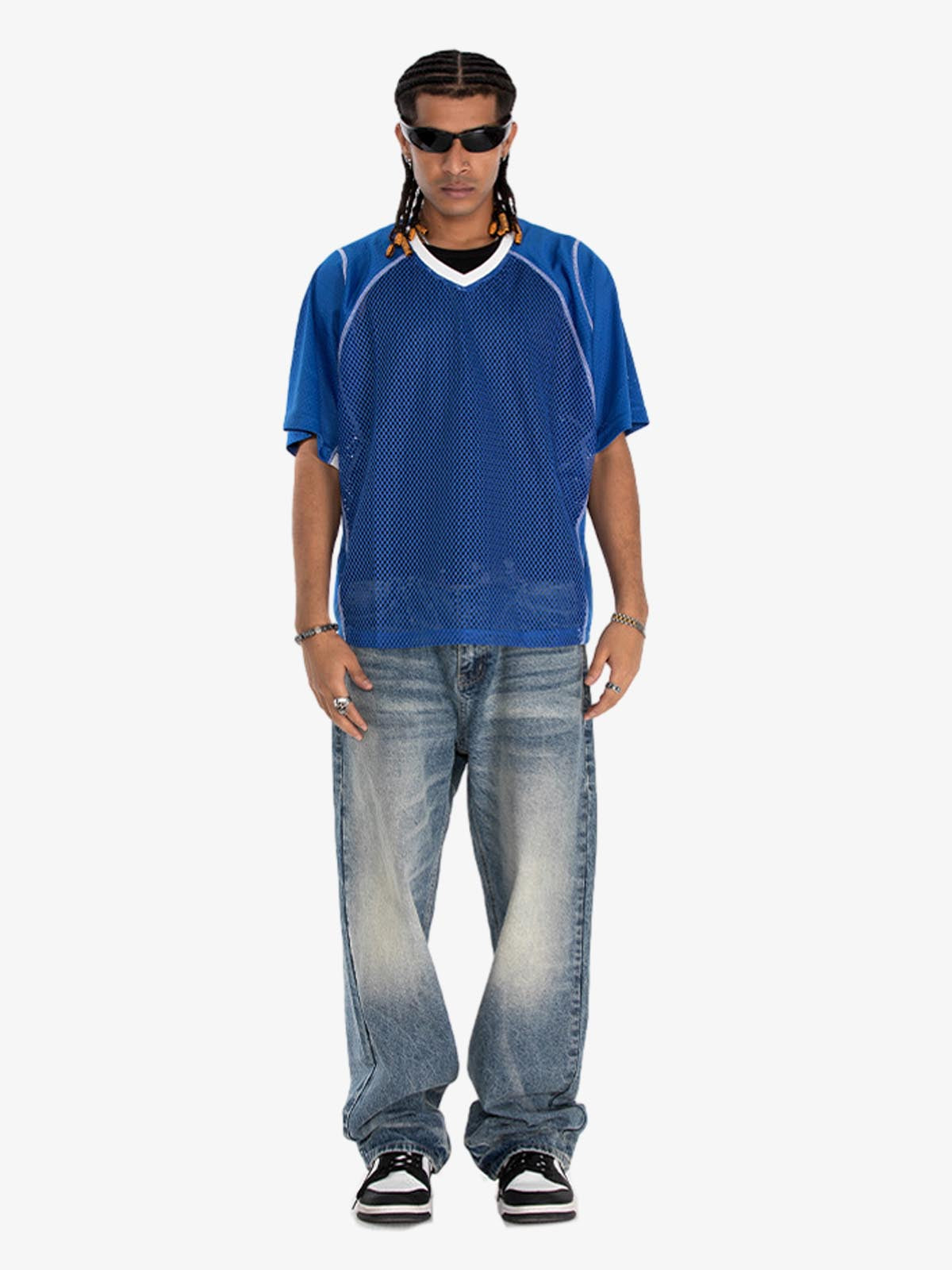 Sport-inspired T-shirt built with breathable mesh paneling and contrast stitching for a layered streetwear look. The lightweight jersey fabric combined with mesh sections creates airflow and texture, while raglan sleeves and curved seams give the piece a technical athletic feel.