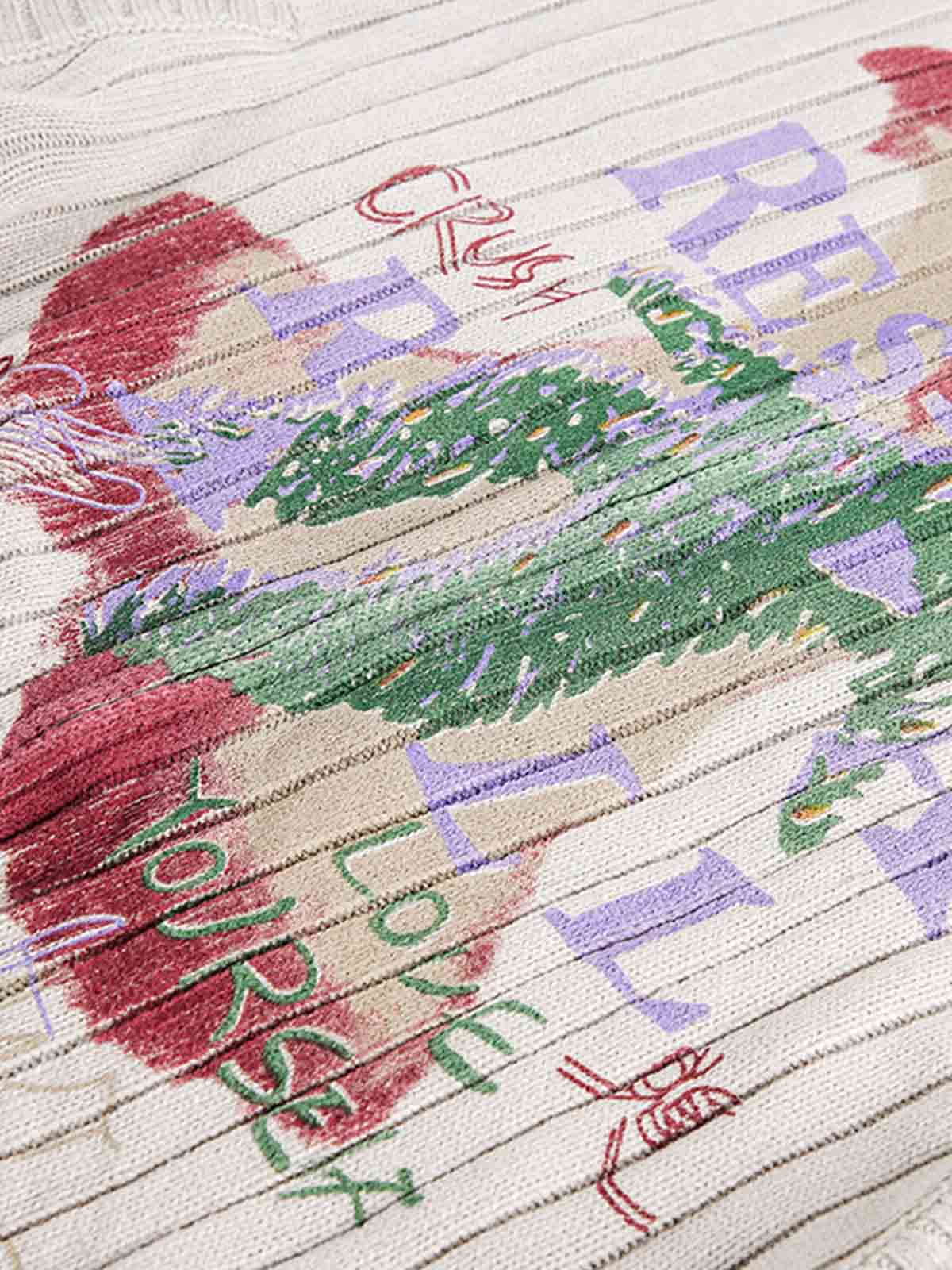 Retro Abstract Print Ribbed Stand Collar Zip-Up Sweater