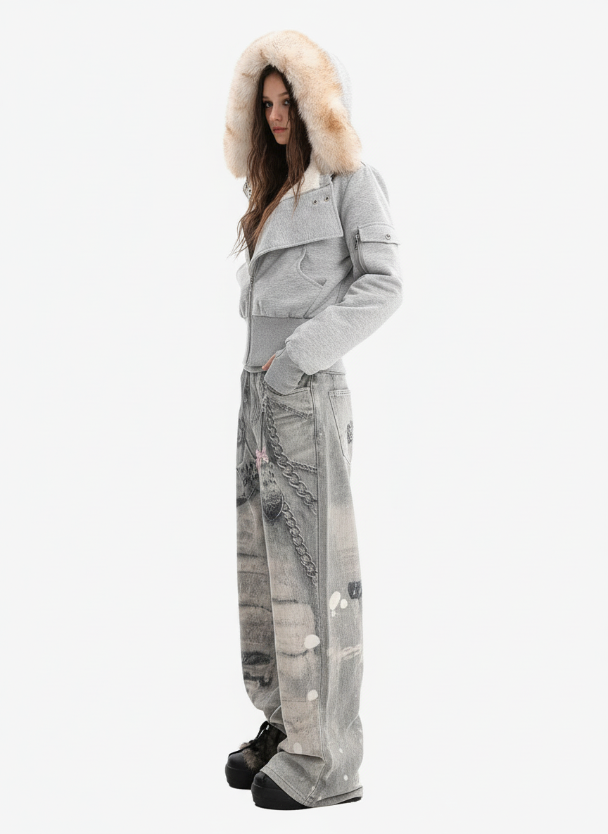 Retro Faux Fur Collar Fleece Zip Up Hoodie Jacket