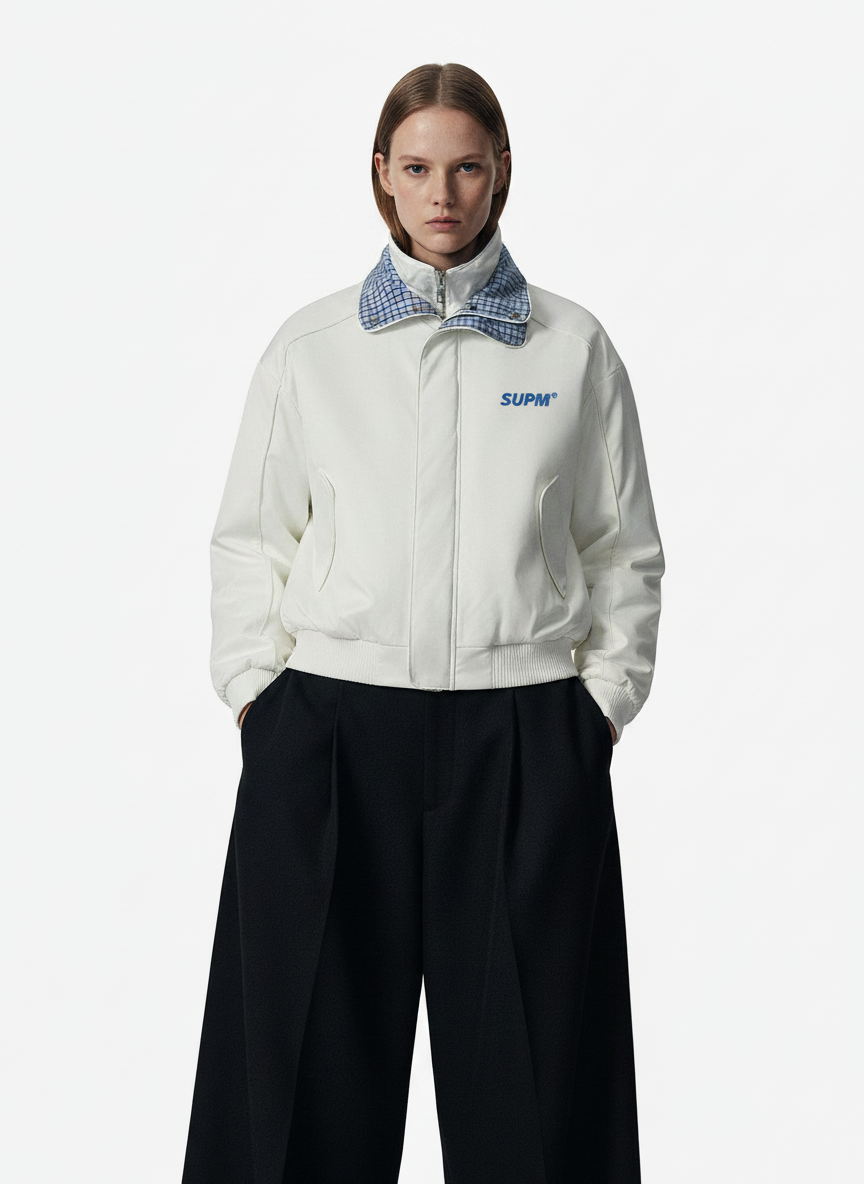 • Design Elements: Plaid collar design, front zipper closure, two side pockets