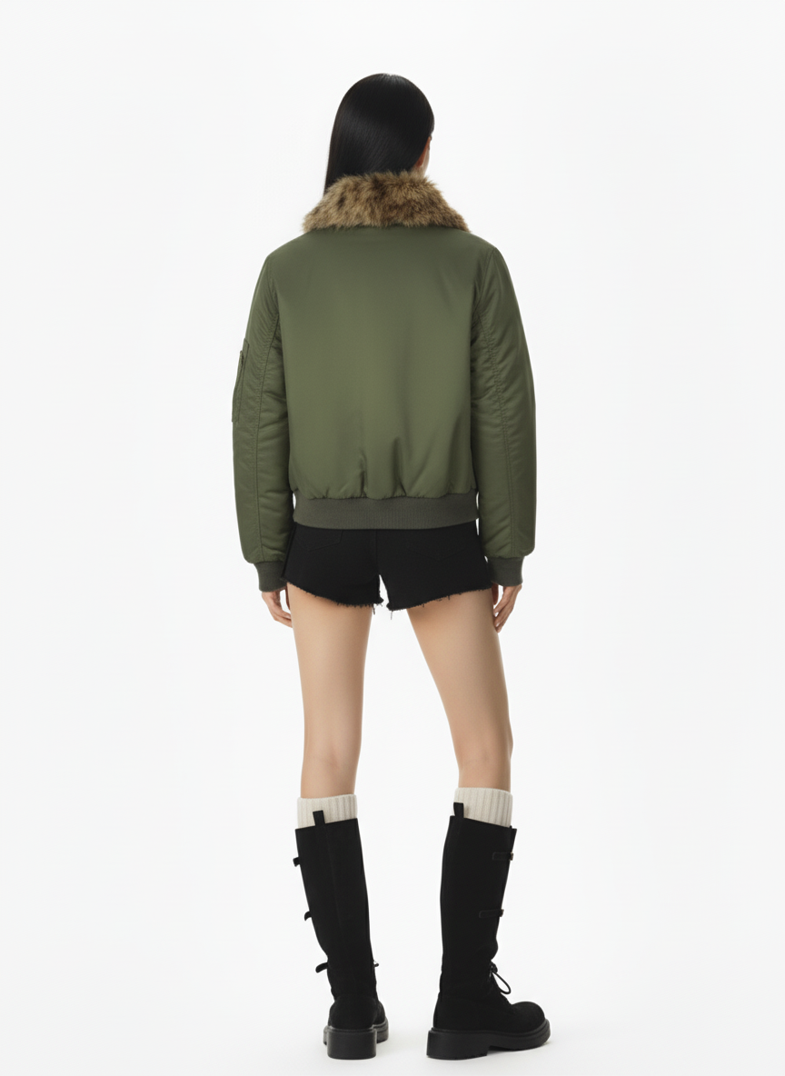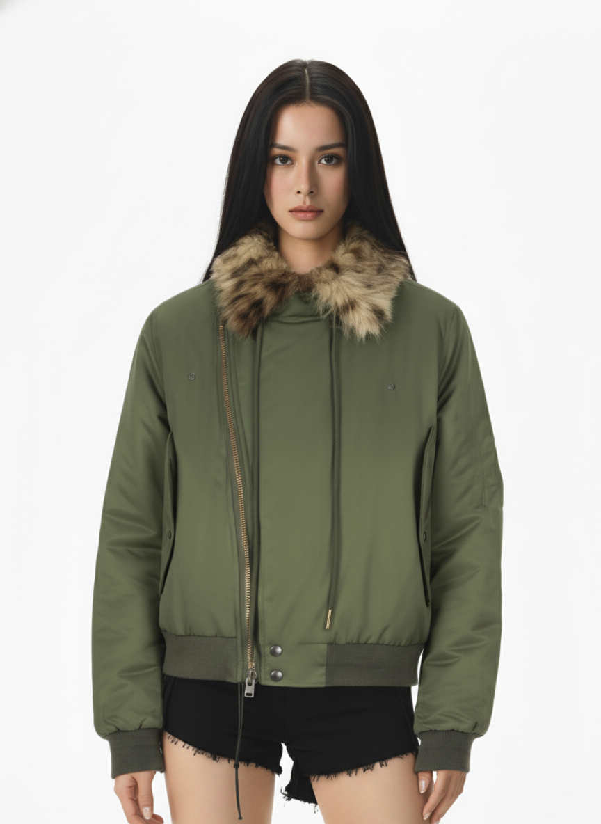 • Design Elements: Leopard fur collar adds a touch of luxury and style