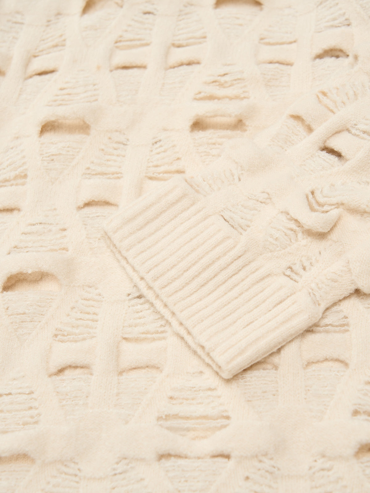 • Design Elements: Unique open-knit pattern, ribbed cuffs and hem, classic crew neck design