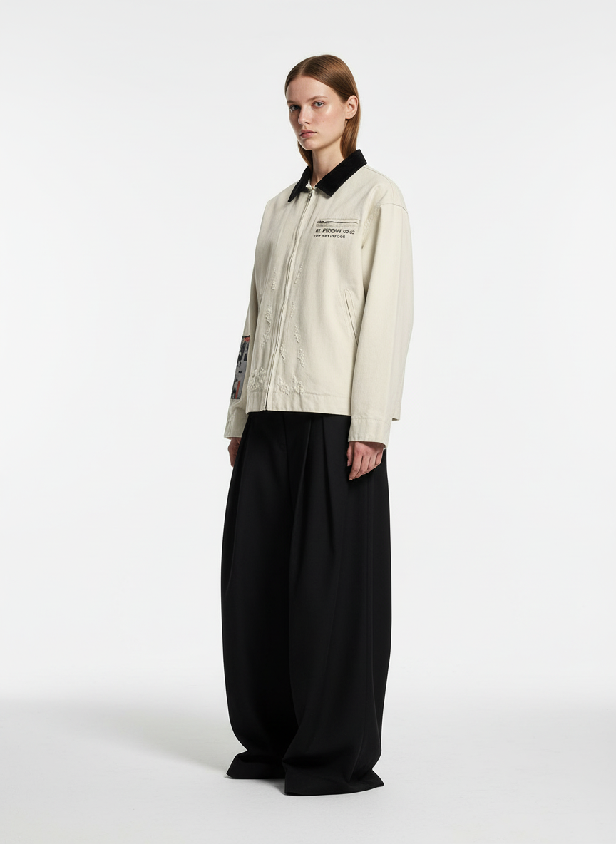• Design Elements: Distressed details, bold lettering on the chest pocket, graphic patch on the sleeve