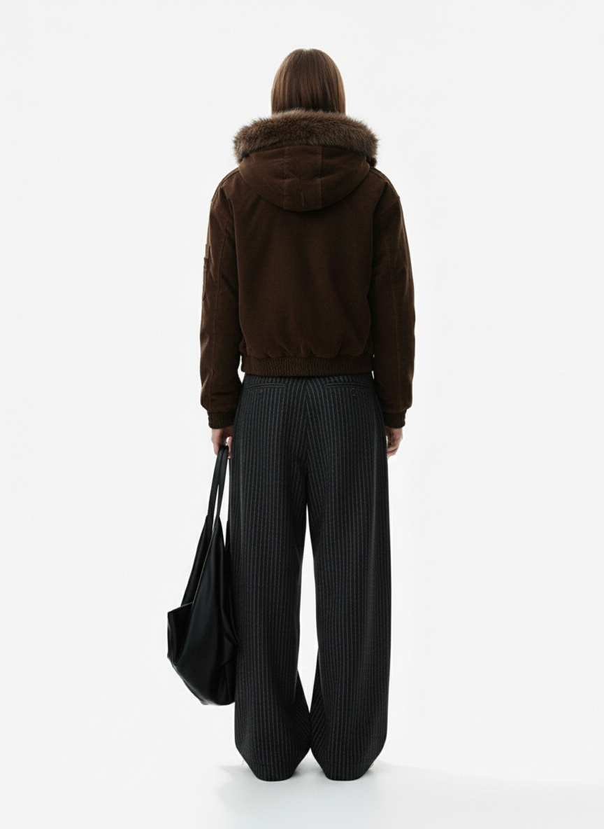 • Design Elements: Classic Pinstripe Pattern, High Waist with Pleats, Wide Leg Cut