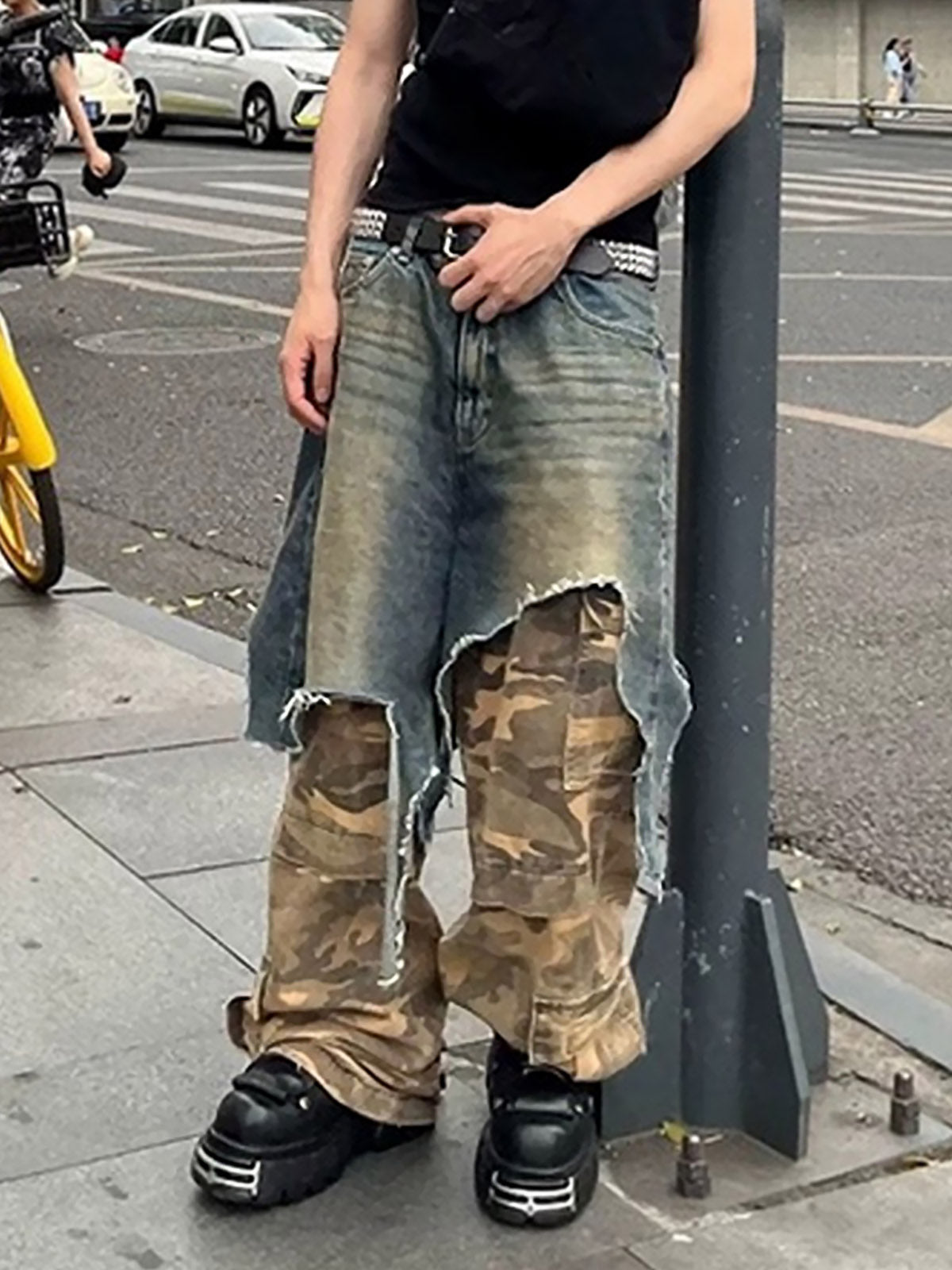 Retro Stitching Faux Two-Piece Camouflage Jeans - 2413