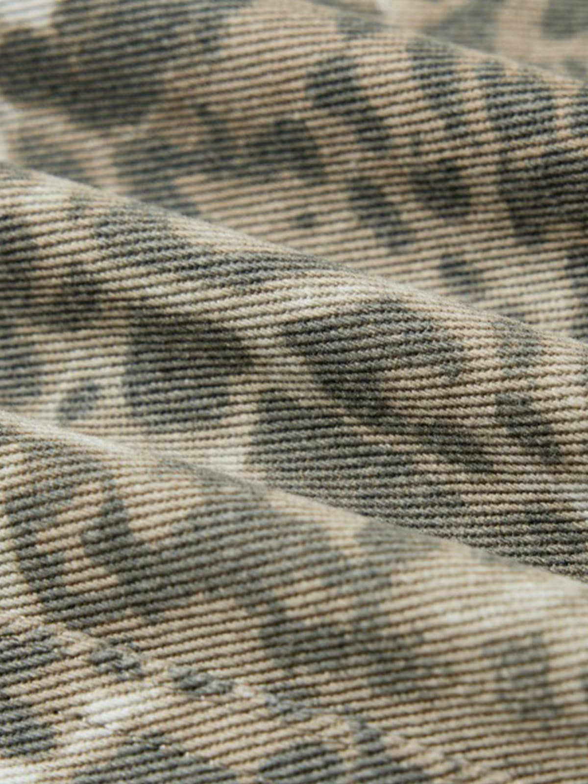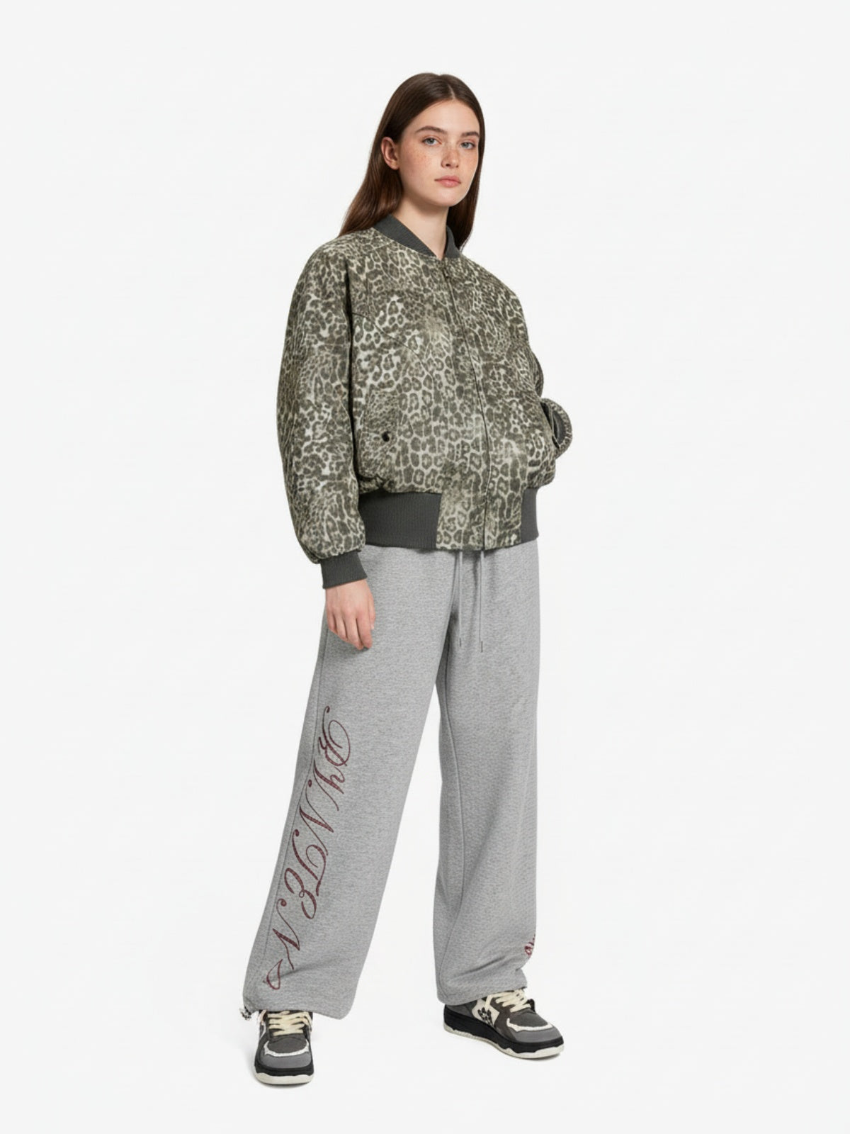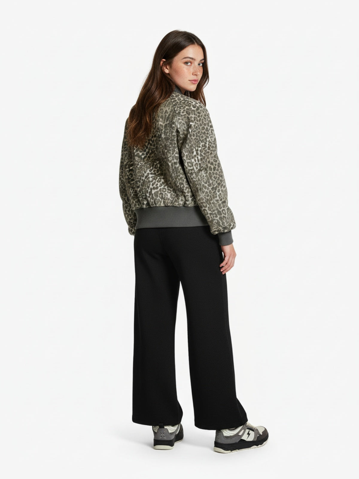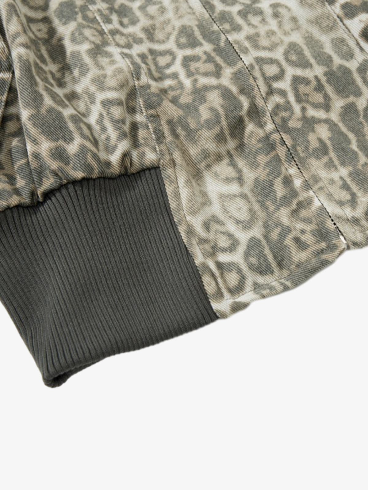 • Design Elements: Leopard print pattern, ribbed cuffs and hem, front zipper closure