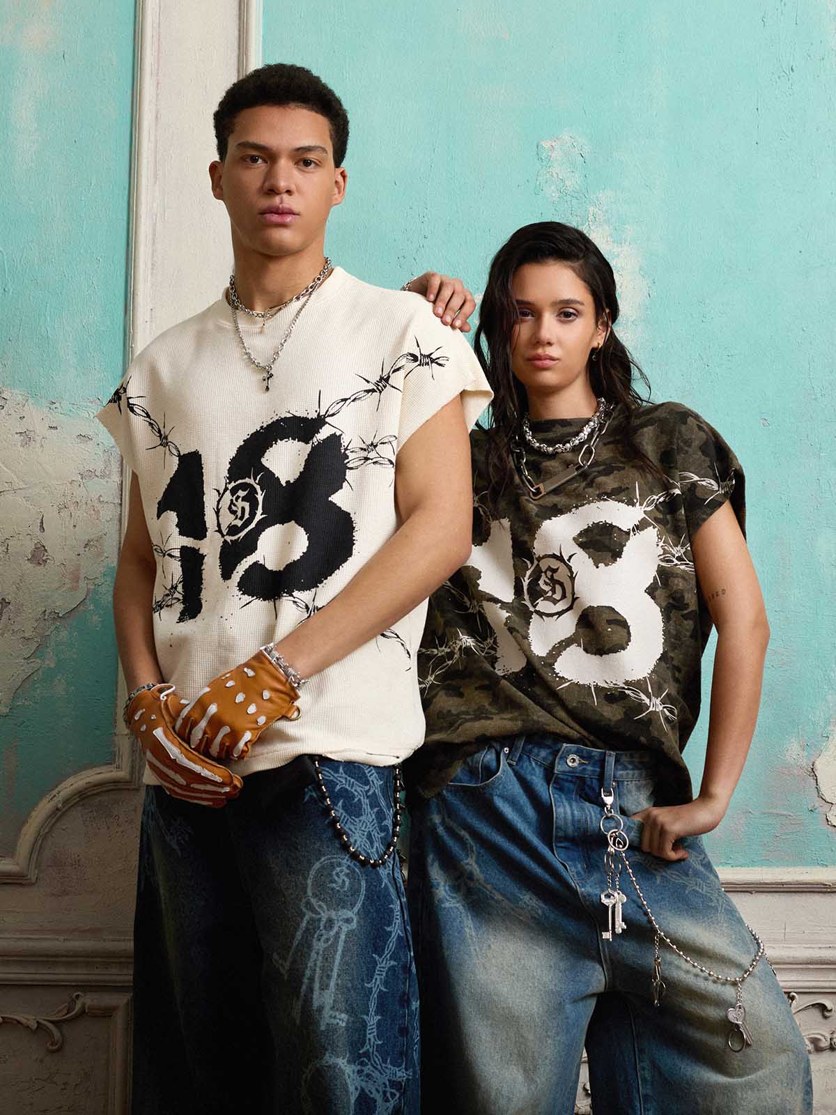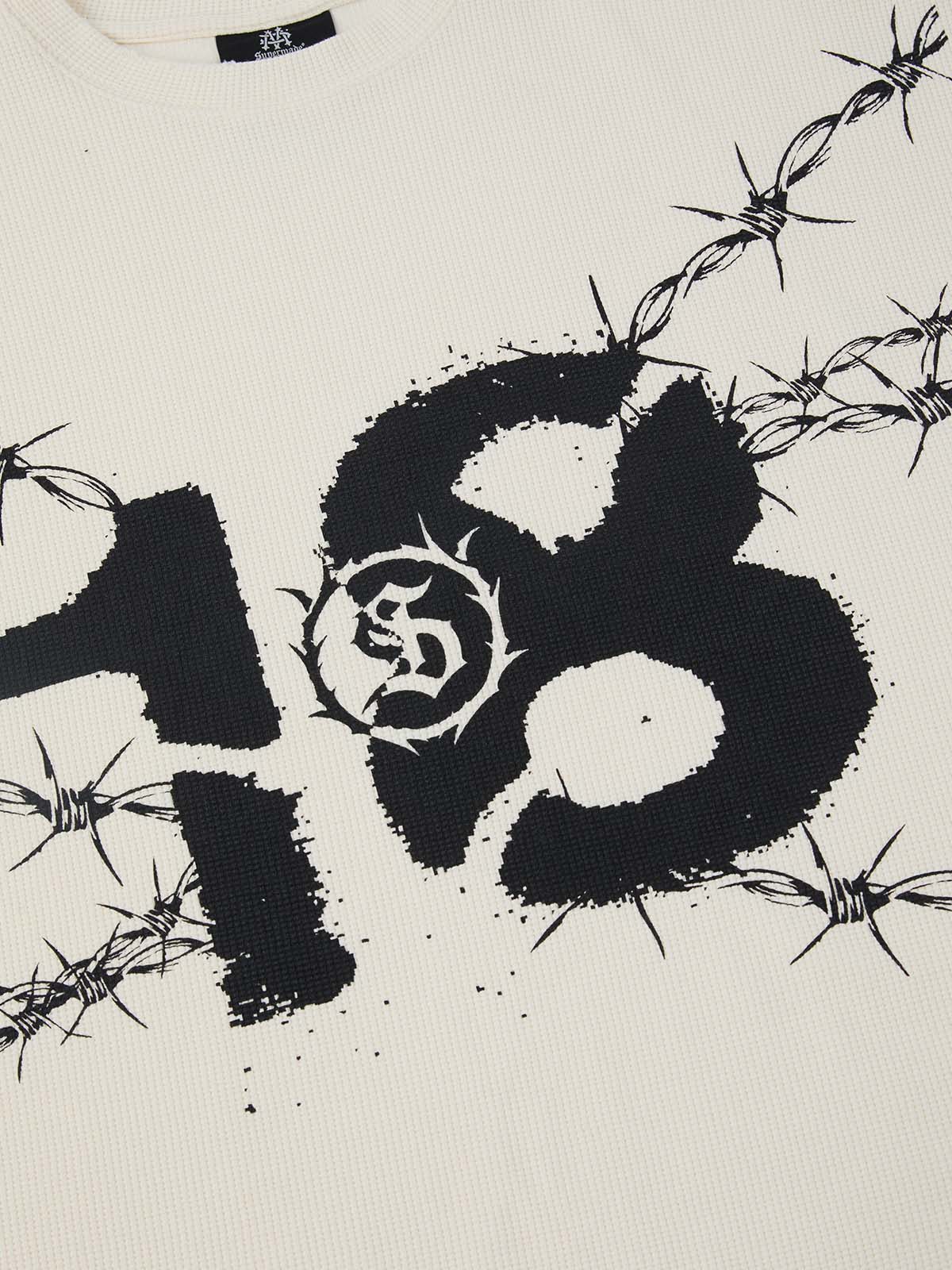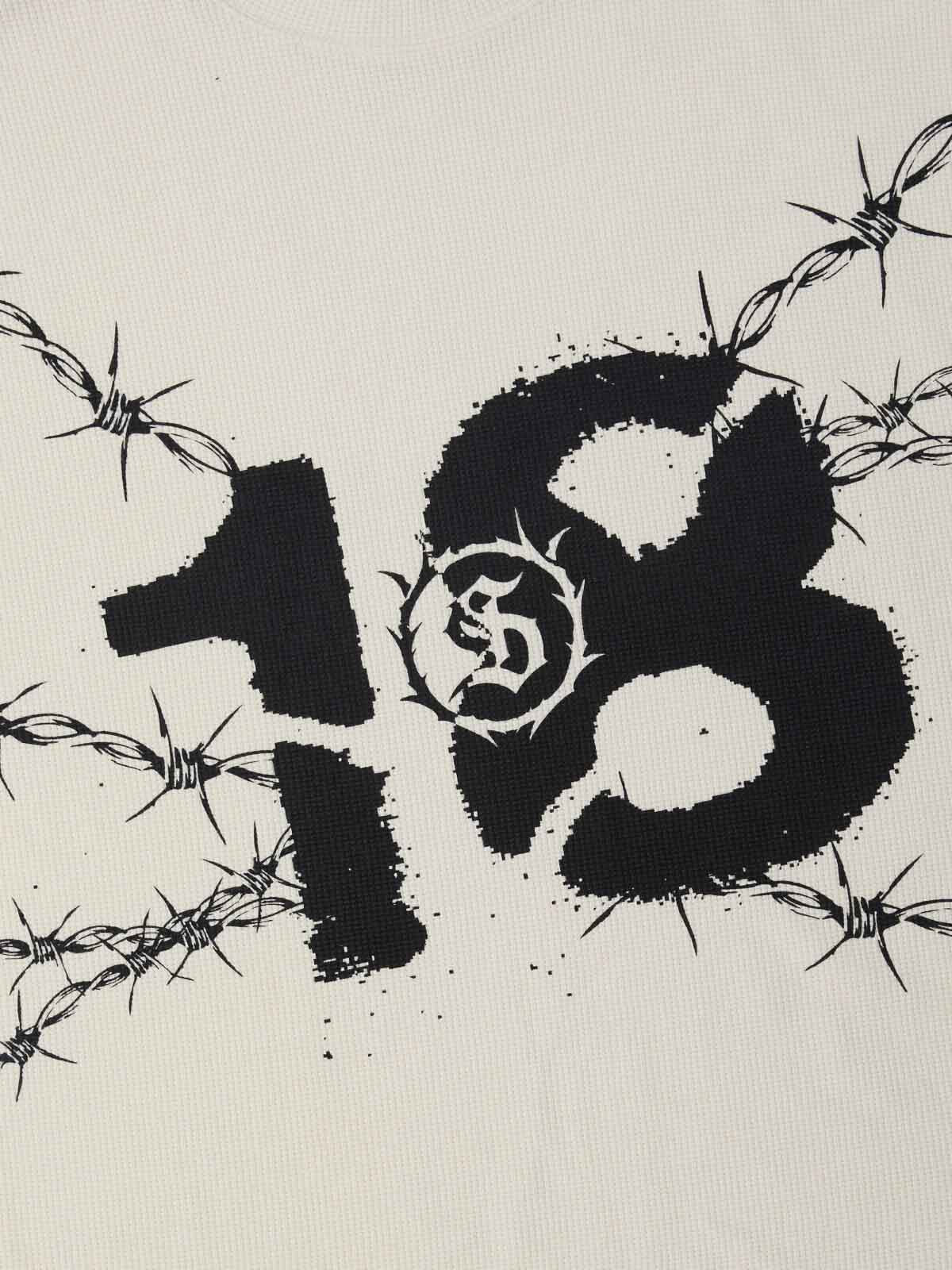 Crafted from textured waffle fabric, this sleeveless T-shirt features a bold “18” number print across the front combined with thorn graphics running diagonally across the body. The contrast between the dark print and the light base highlights the layered design, while the waffle texture adds extra depth and structure to the piece.