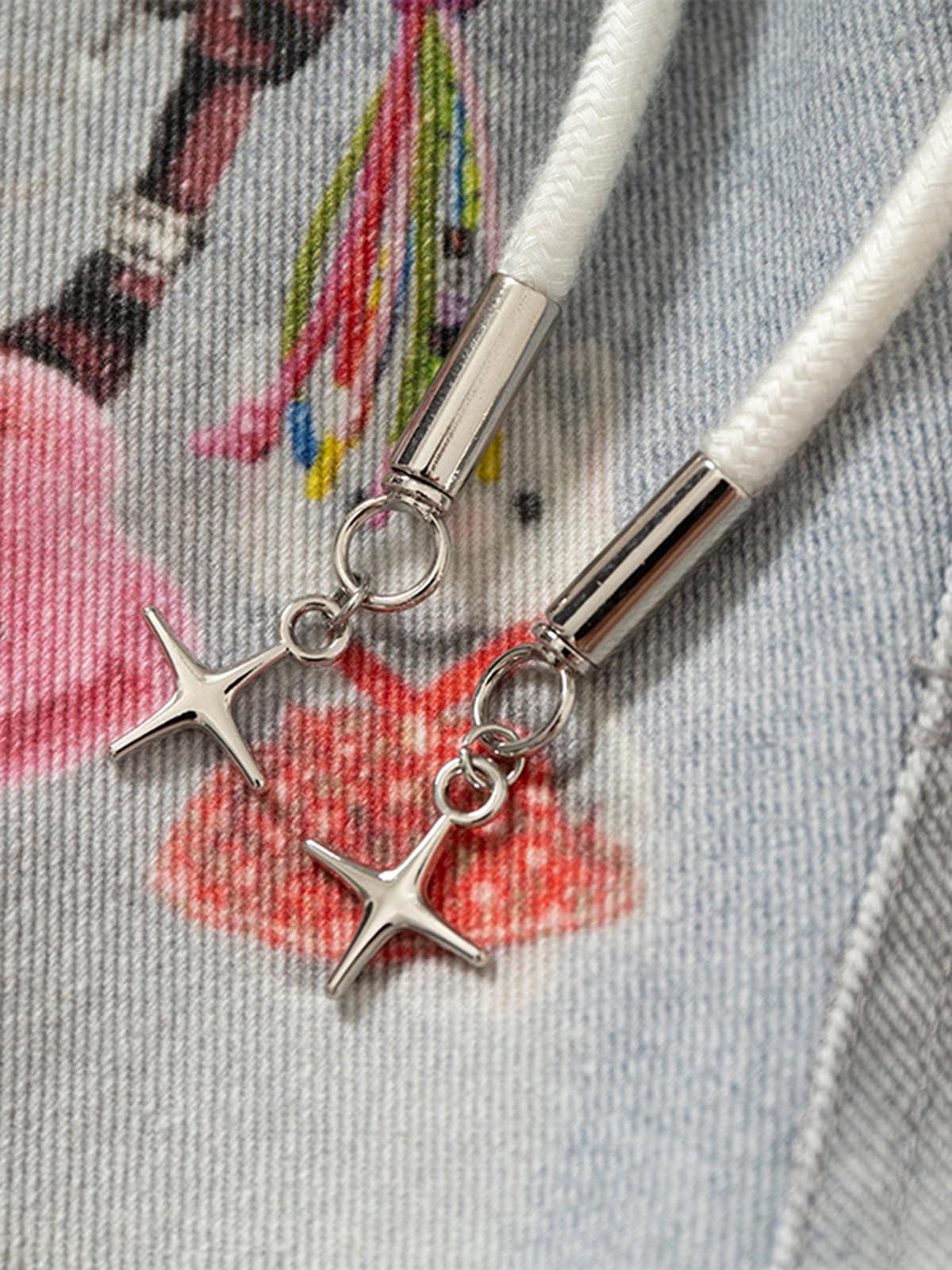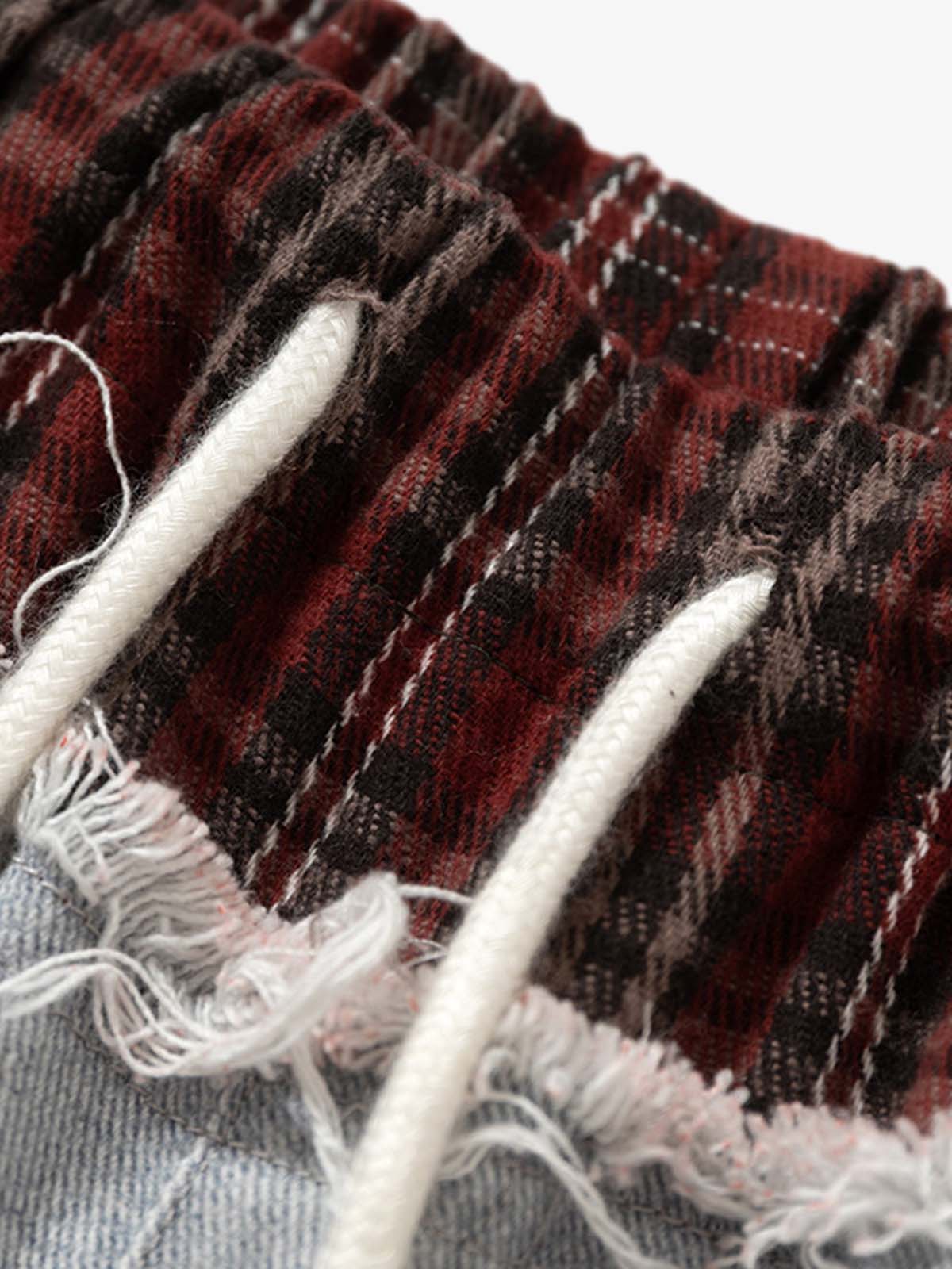 • Design Elements: Plaid waistband, graphic print, distressed details