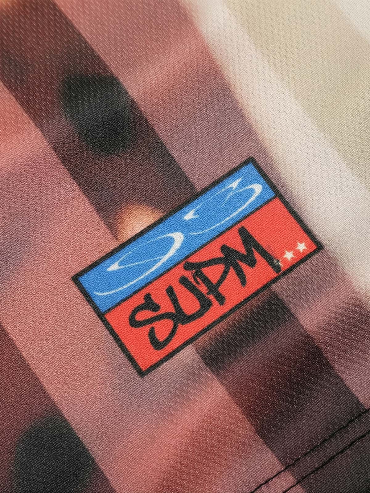 Constructed from lightweight polyester mesh fabric, this jersey T-shirt features a relaxed unisex fit built for breathability and everyday streetwear styling. The front is defined by a layered abstract graphic composition set over a dog portrait background, creating a distorted collage visual effect, while the back contrasts with a darker base and oversized graphic detailing for added statement appeal. The athletic mesh structure enhances airflow, making it ideal for both sport-inspired looks and casual layering.