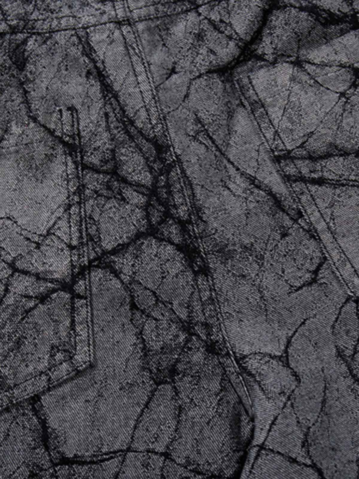 Bold statement denim featuring an all-over crackle texture print that gives the fabric a worn, stone-like look. Angular contrast panels with metal studs run across the legs, creating a strong layered visual while subtle pleated shaping adds structure and volume to the wide silhouette.