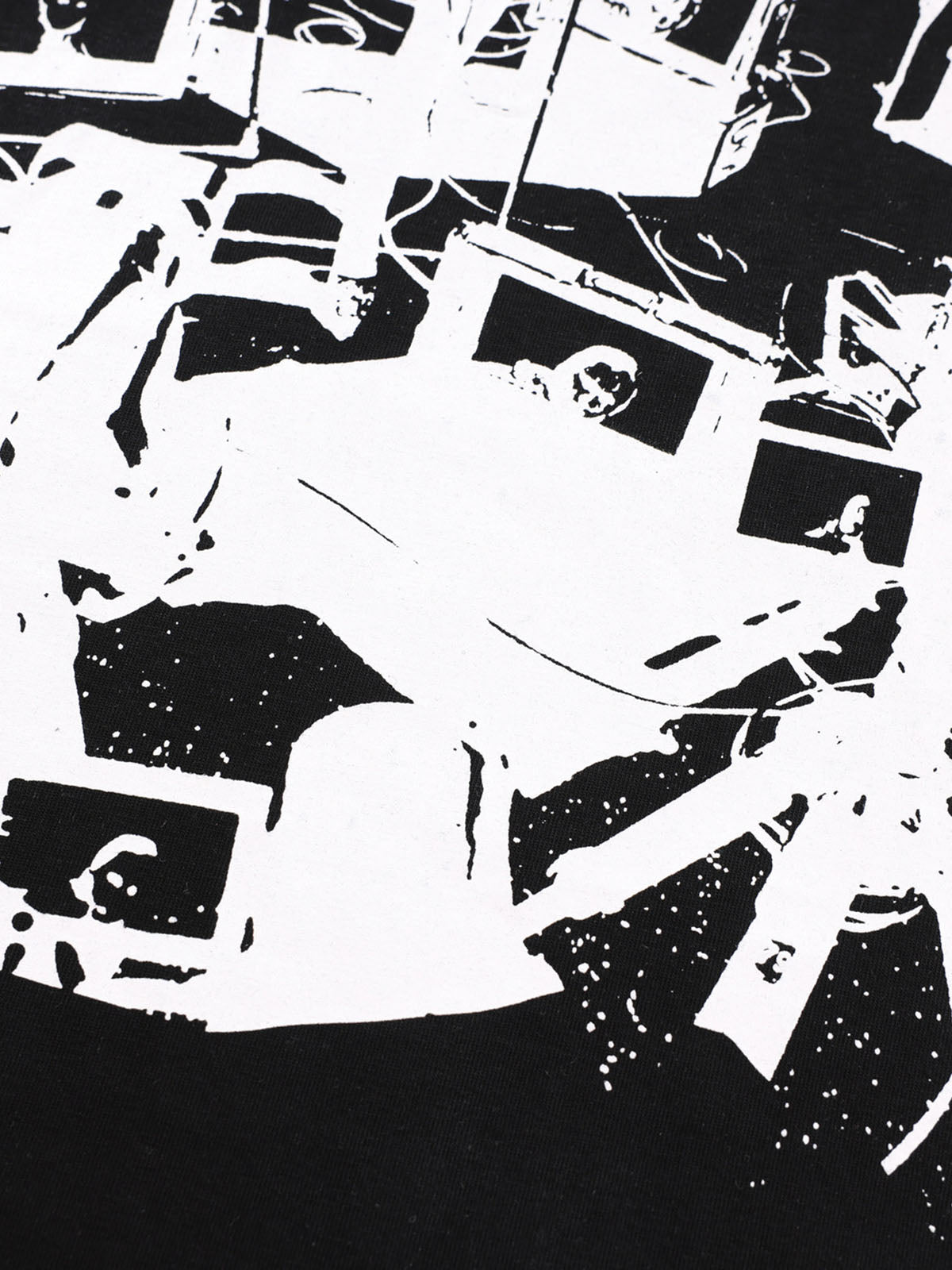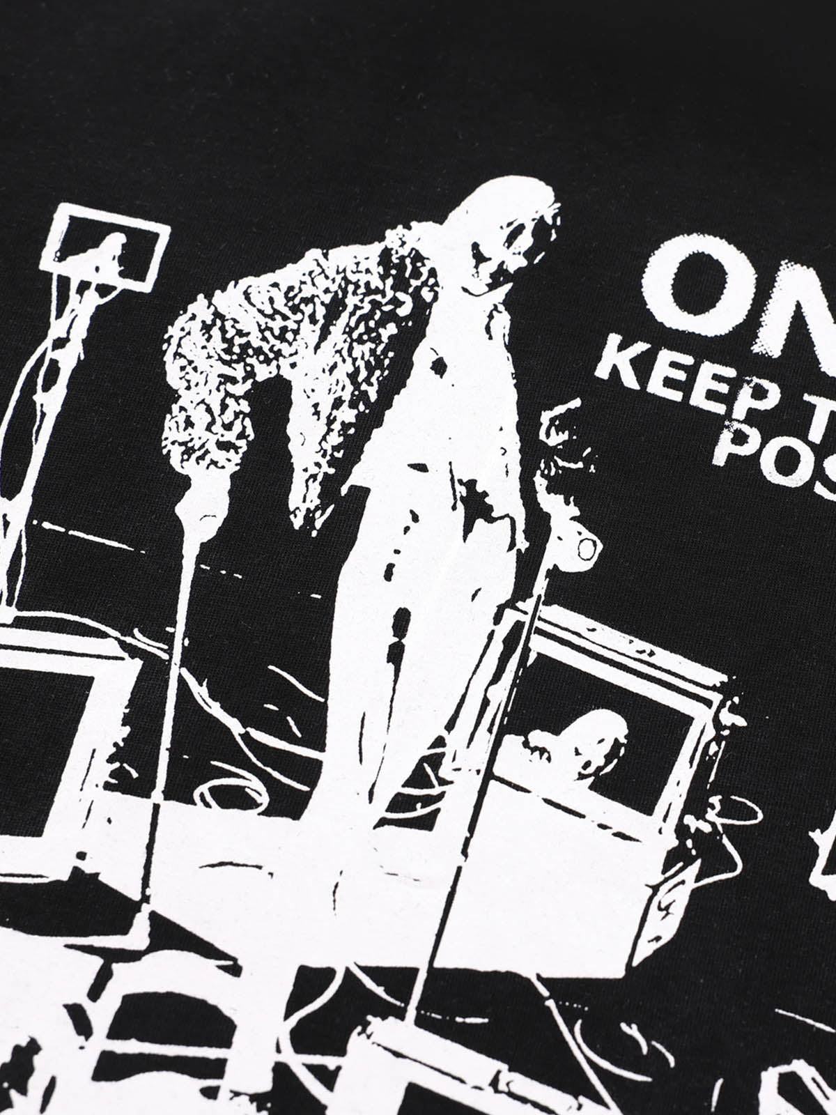 • Design Elements: Bold graphic print with "ON LIVE" text, artistic black-and-white illustration