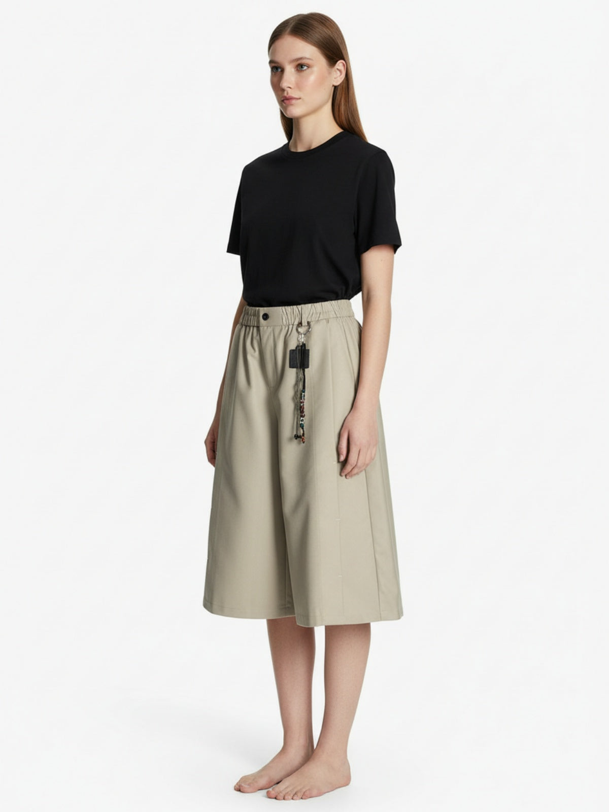 • Design Elements: Elastic waistband, decorative keychain accessory, relaxed fit