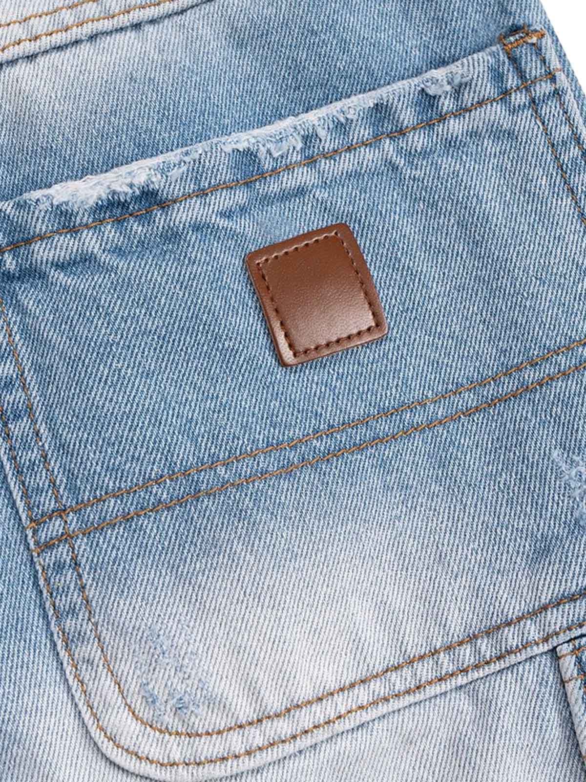 • Design Elements: Distressed details, ruffled hem, and adjustable waist tie