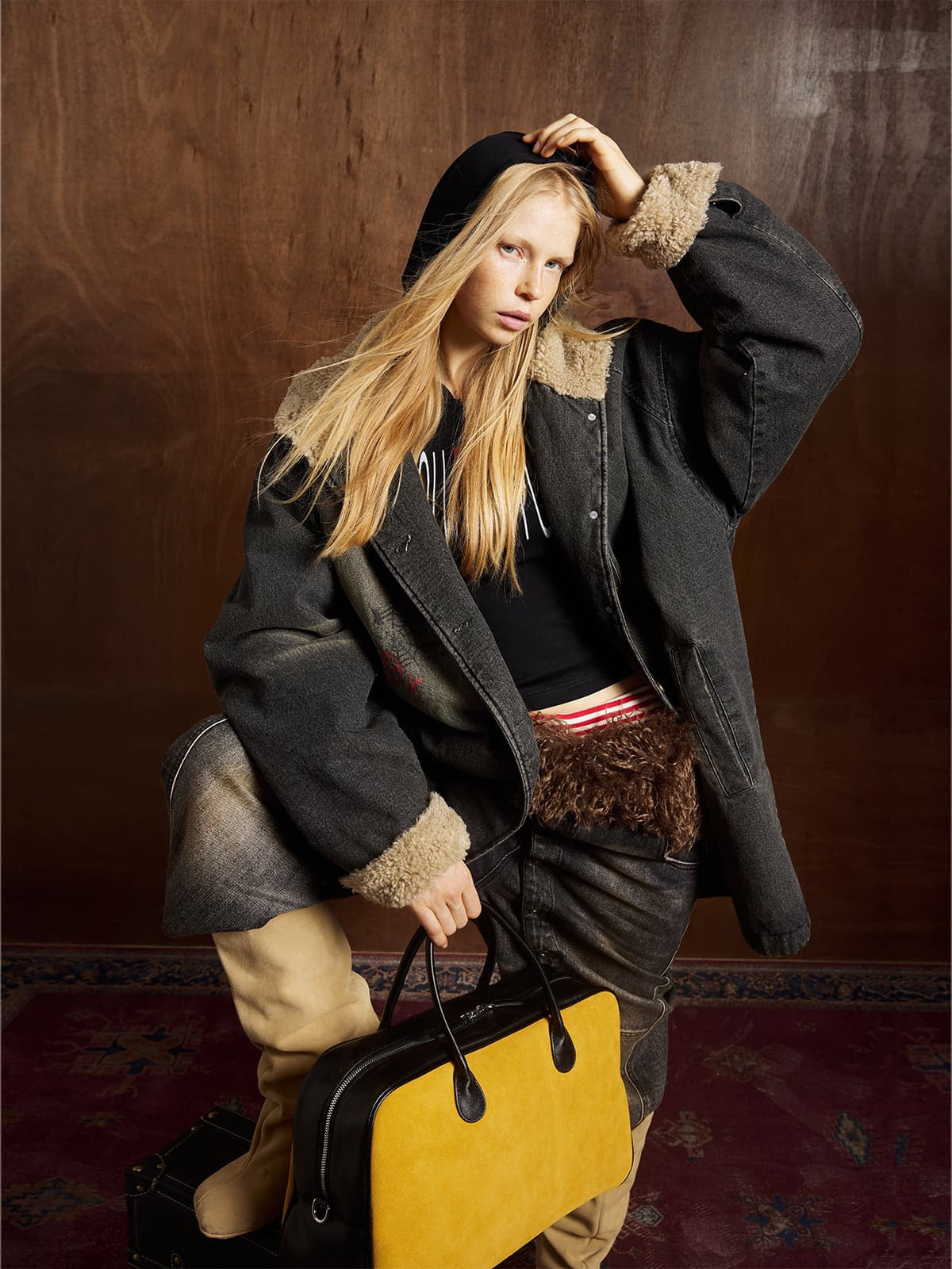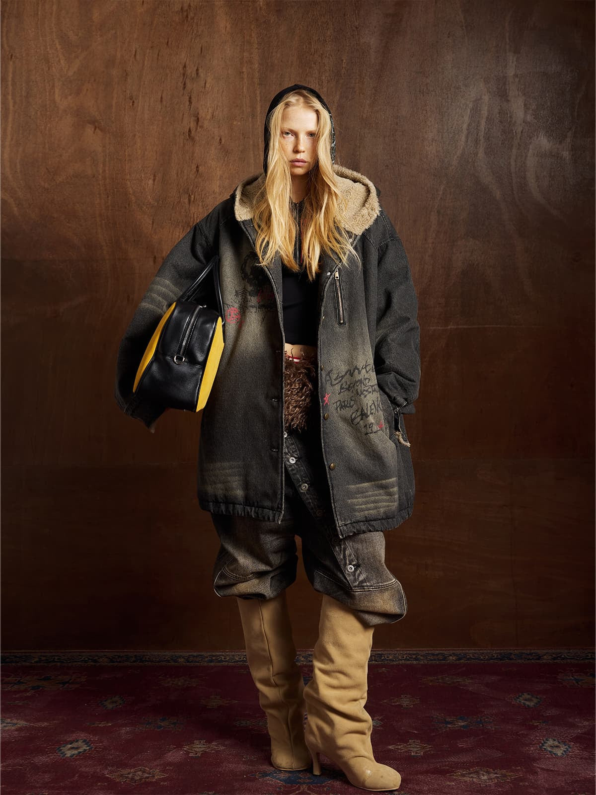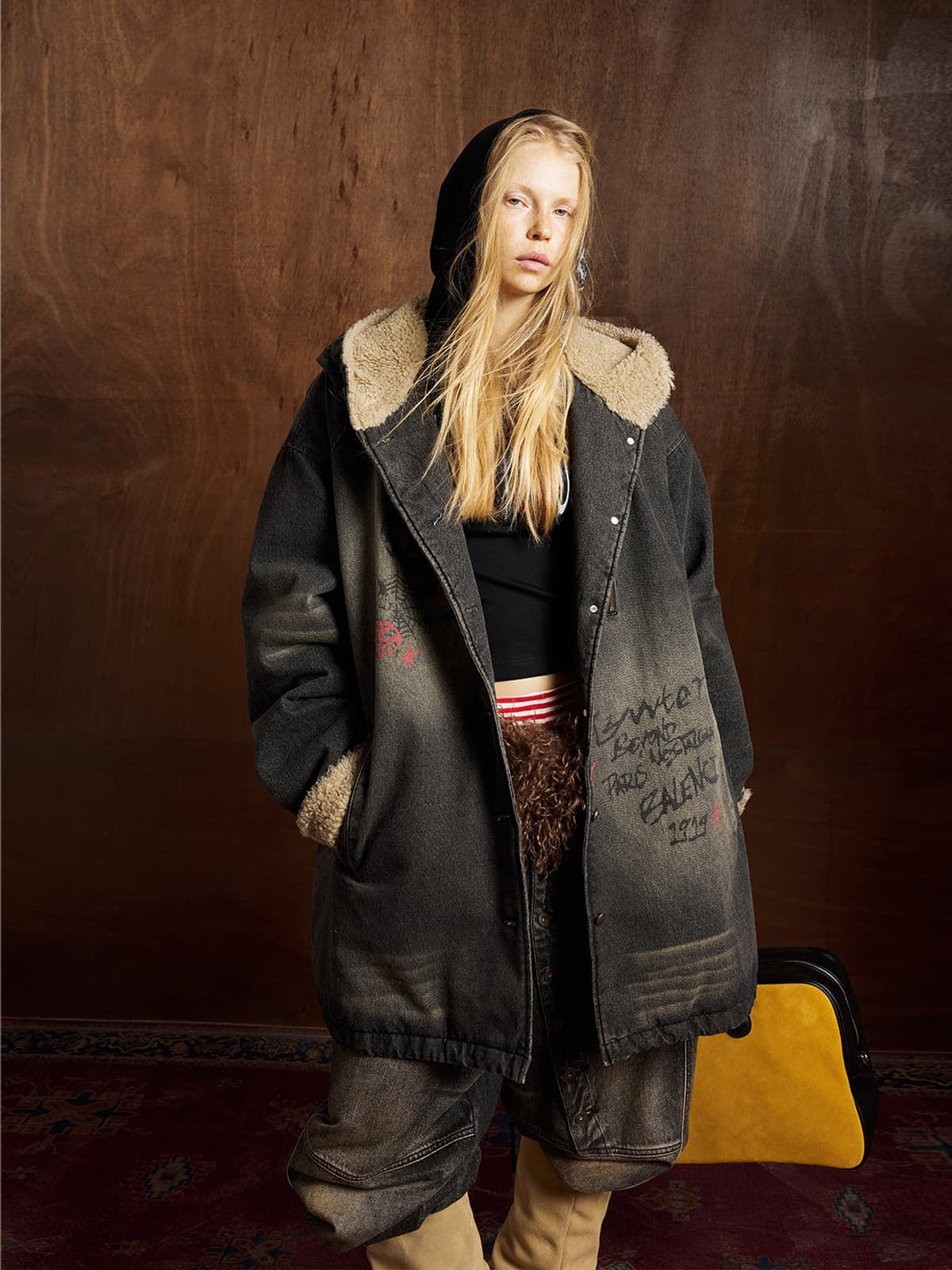 Distressed Graffiti Washed Long Lamb Fleece Denim Cotton Jacket
