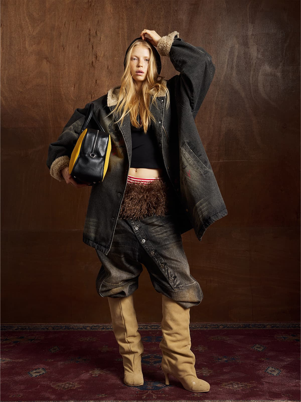 • Design Elements: Faux fur collar and cuffs, button closures, patch pockets