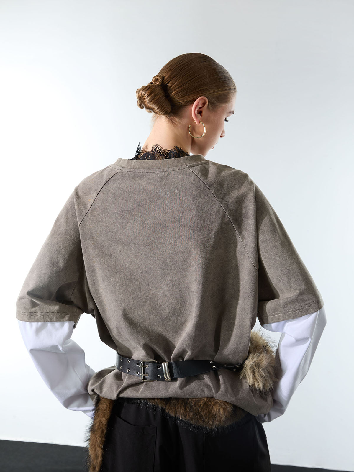 Washed Contrast Color Print Long Sleeve Cotton T-shirt
