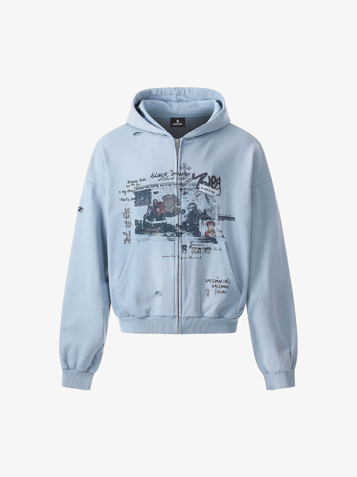 Zip-up hoodie featuring collage-style graphic prints on the front and back. Made from cotton sweatshirt fabric with a soft feel and finished with subtle distressed holes and raw-edge details for a worn-in look.