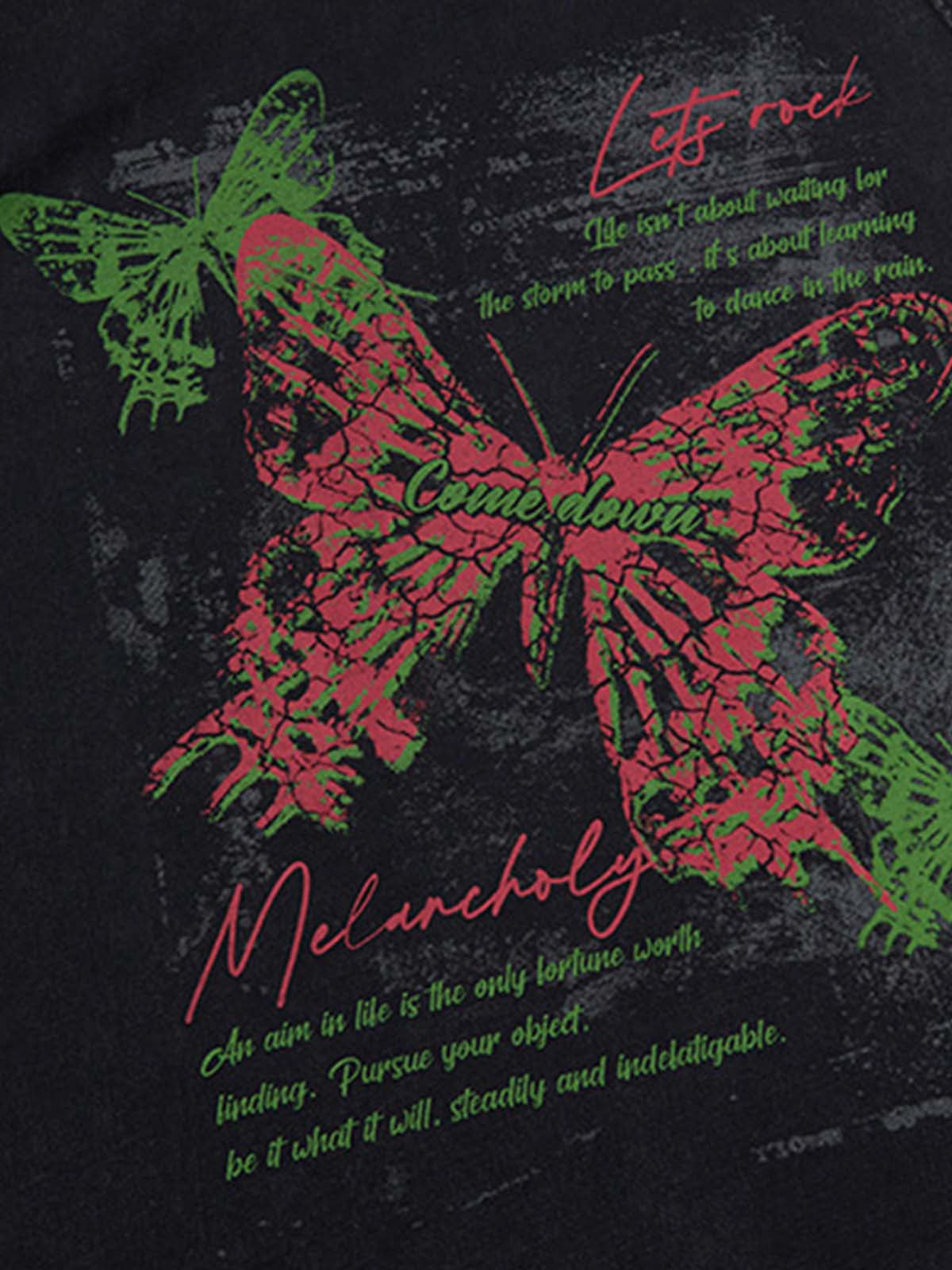 • Design Elements: Vibrant butterfly graphic print, distressed details, bold text overlays