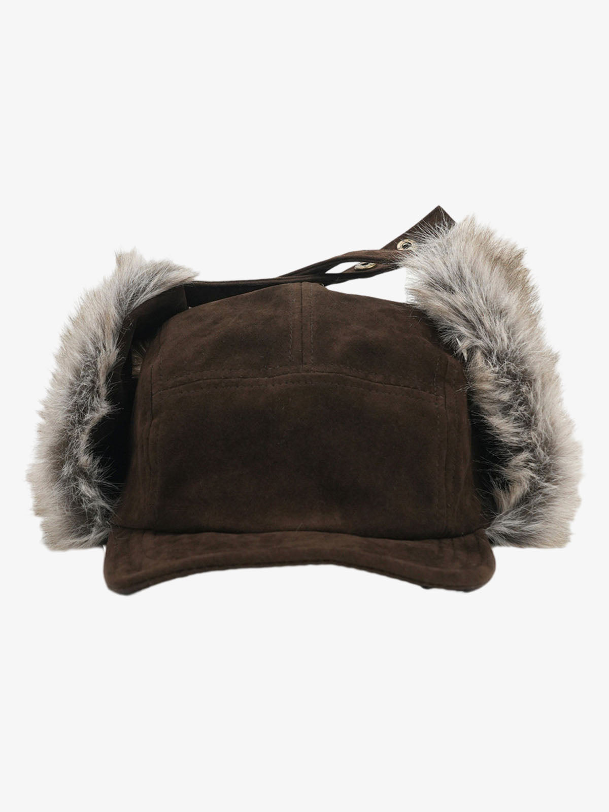 A trapper-style hat featuring a suede-texture outer with plush faux fur earflaps for extra warmth. The curved brim adds structure while the adjustable chin strap helps keep the hat secure. A classic winter design inspired by traditional aviator and ushanka styles.