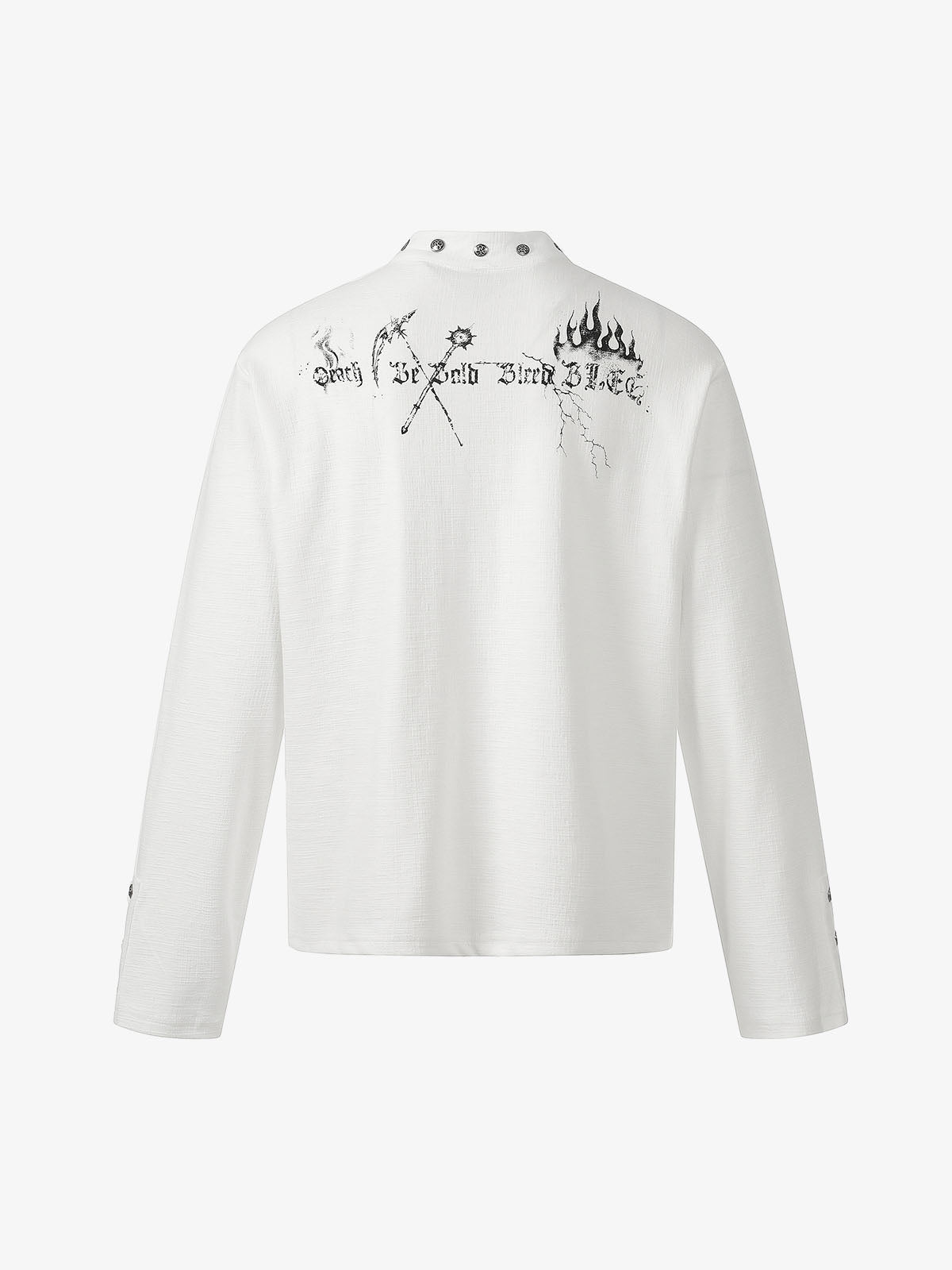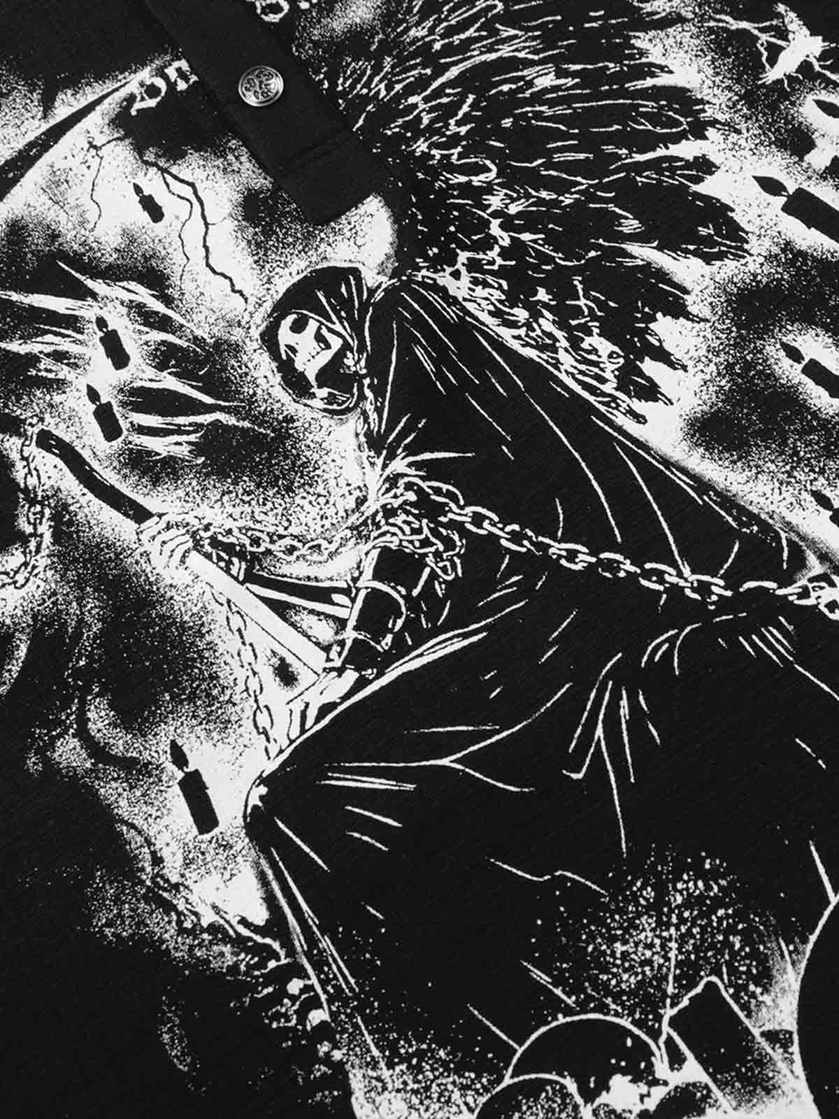 The Gothic Angel Skull Graphic Long Sleeve T-Shirt features a striking dark illustration with angel wings, skull elements, and symbolic gothic artwork. The metal studded collar detail adds a bold punk edge, while the contrast front and back graphics create a dramatic visual. Designed for statement streetwear looks, it blends gothic aesthetics with modern oversized styling.