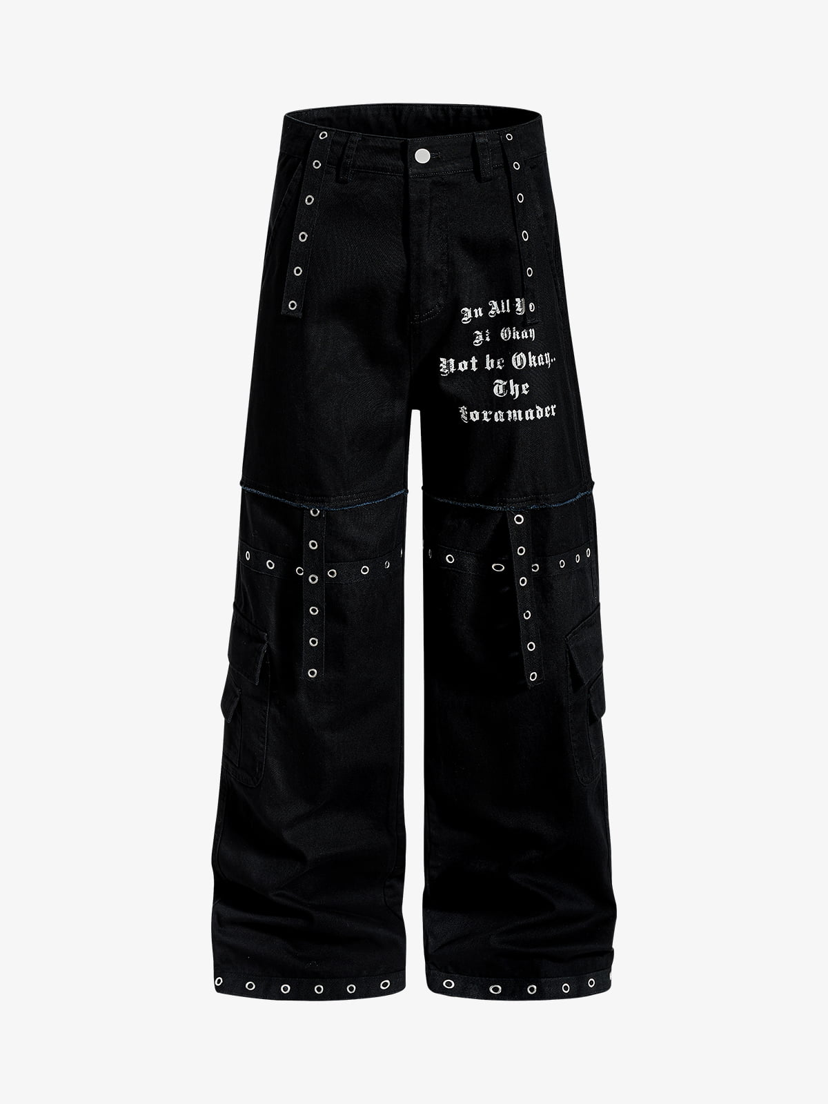 Wide-leg pants made from cotton fabric with a structured silhouette. Designed with layered panels featuring metal eyelet details and finished with gothic-style text graphics and raw-edge accents for a bold streetwear look.