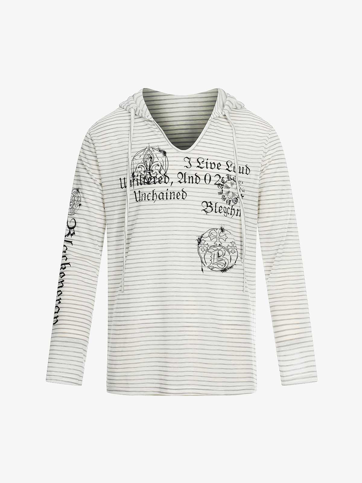 Graphic Print and V-Neck Striped Long Sleeve Hooded T-Shirt