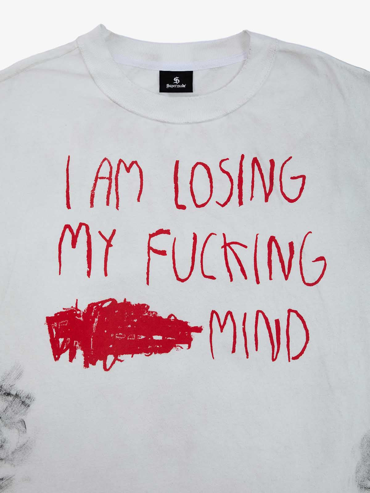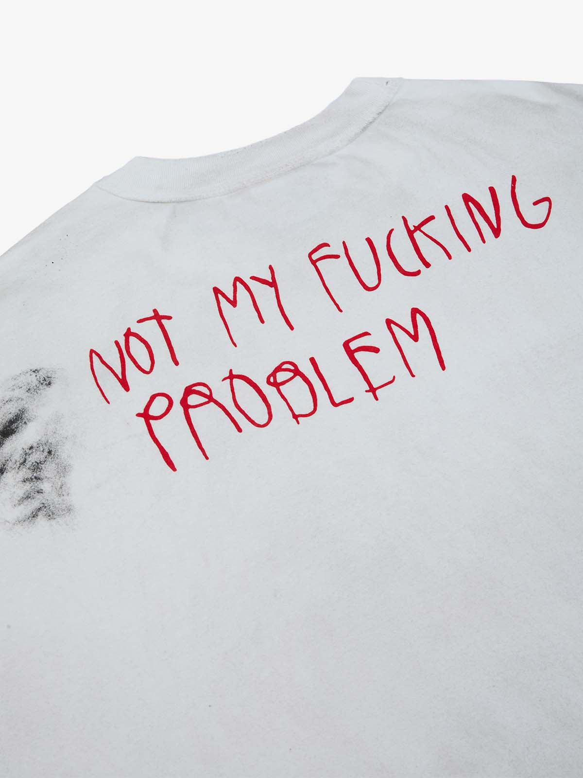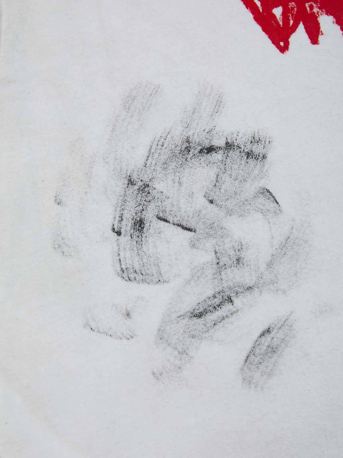 Constructed from smooth plain knit cotton, this sleeveless tee features a boxy relaxed silhouette with cut-off armholes for a raw, deconstructed look. The front and back are finished with handwritten slogan graphics, combined with smeared stains and splatter effects to create a chaotic DIY visual. Distressed dirty wash treatment and frayed edges add depth and worn character, reinforcing the rebellious grunge aesthetic throughout the piece.