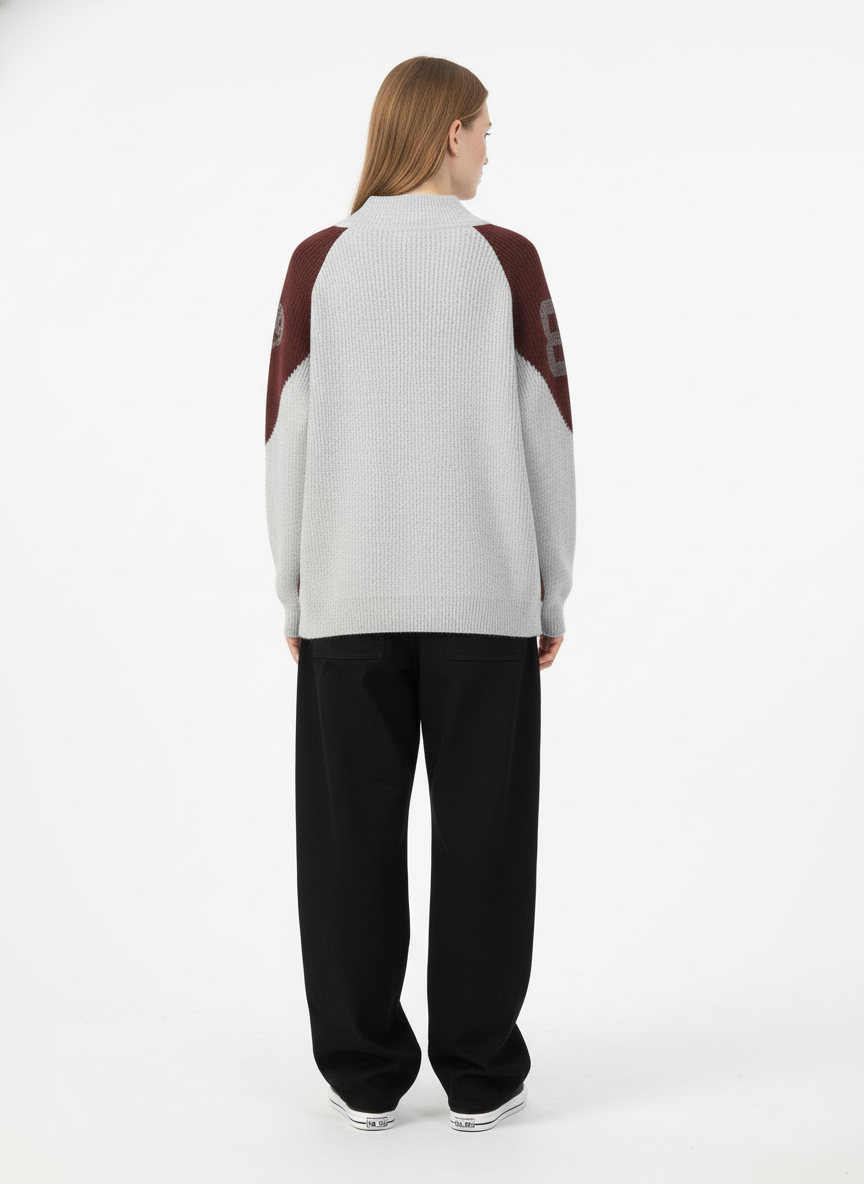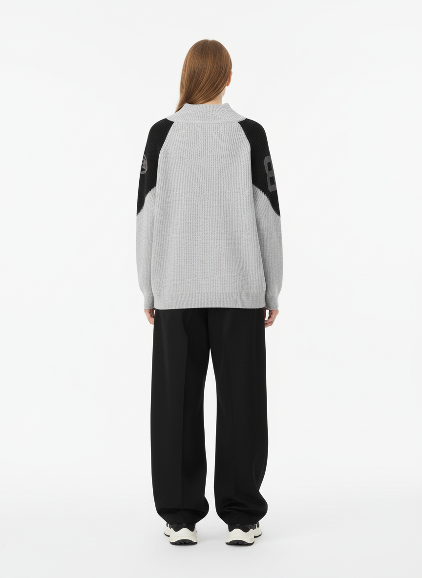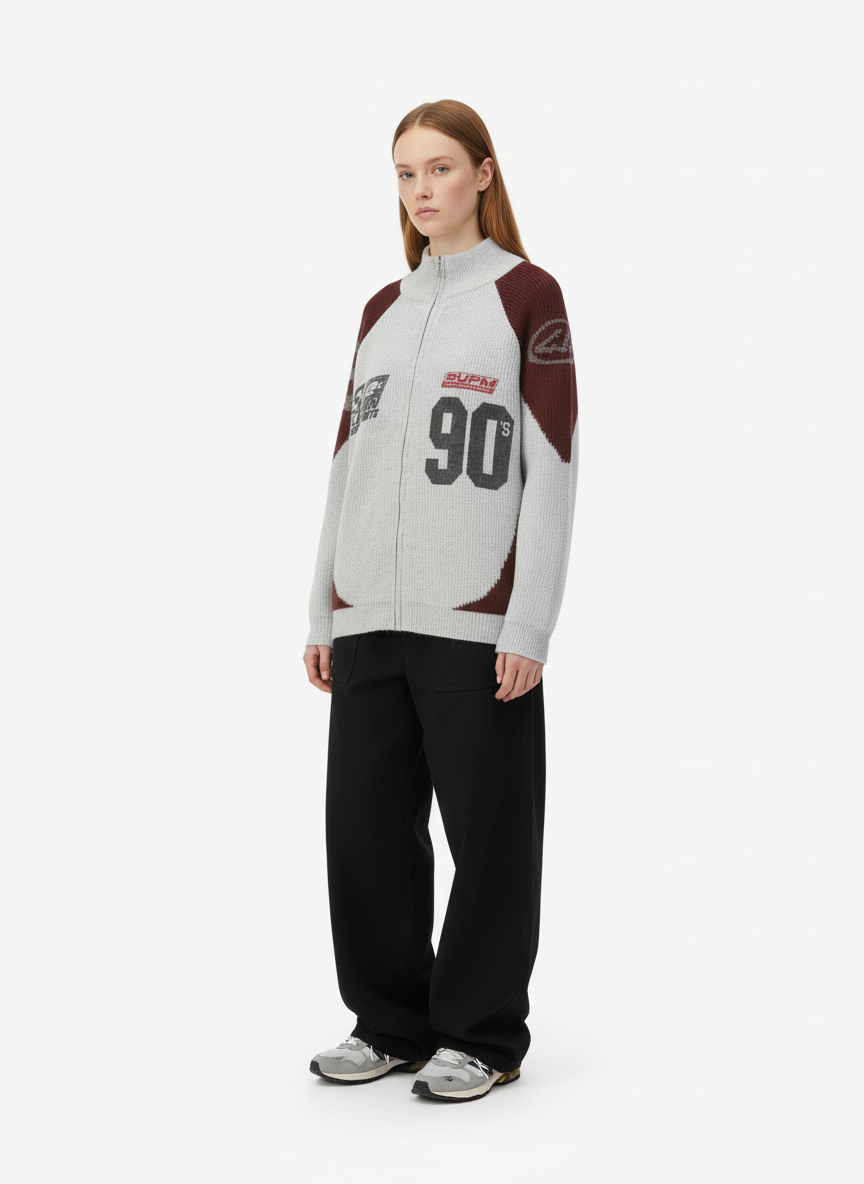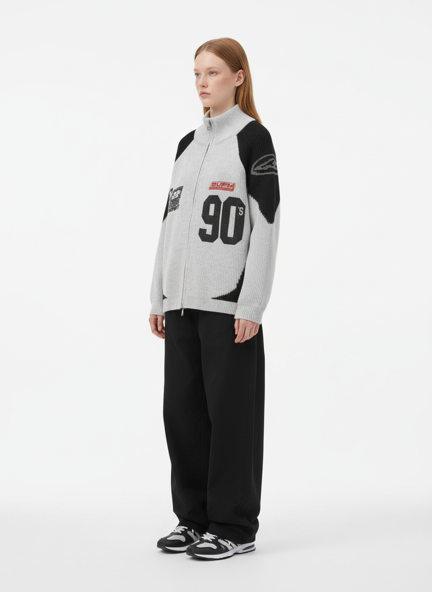 • Design Elements: Contrasting sleeve panels with geometric patterns, bold number print on the front, ribbed cuffs and hem