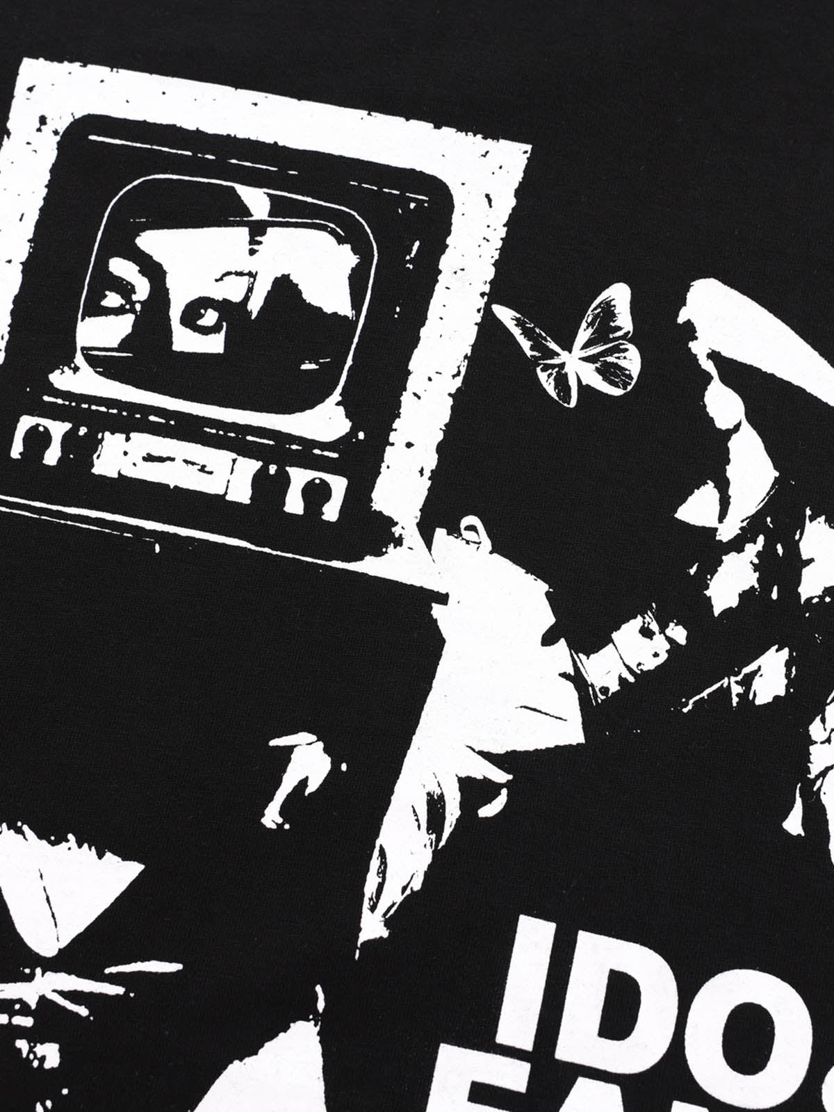 • Design Elements: Bold graphic print with a retro television and artistic imagery