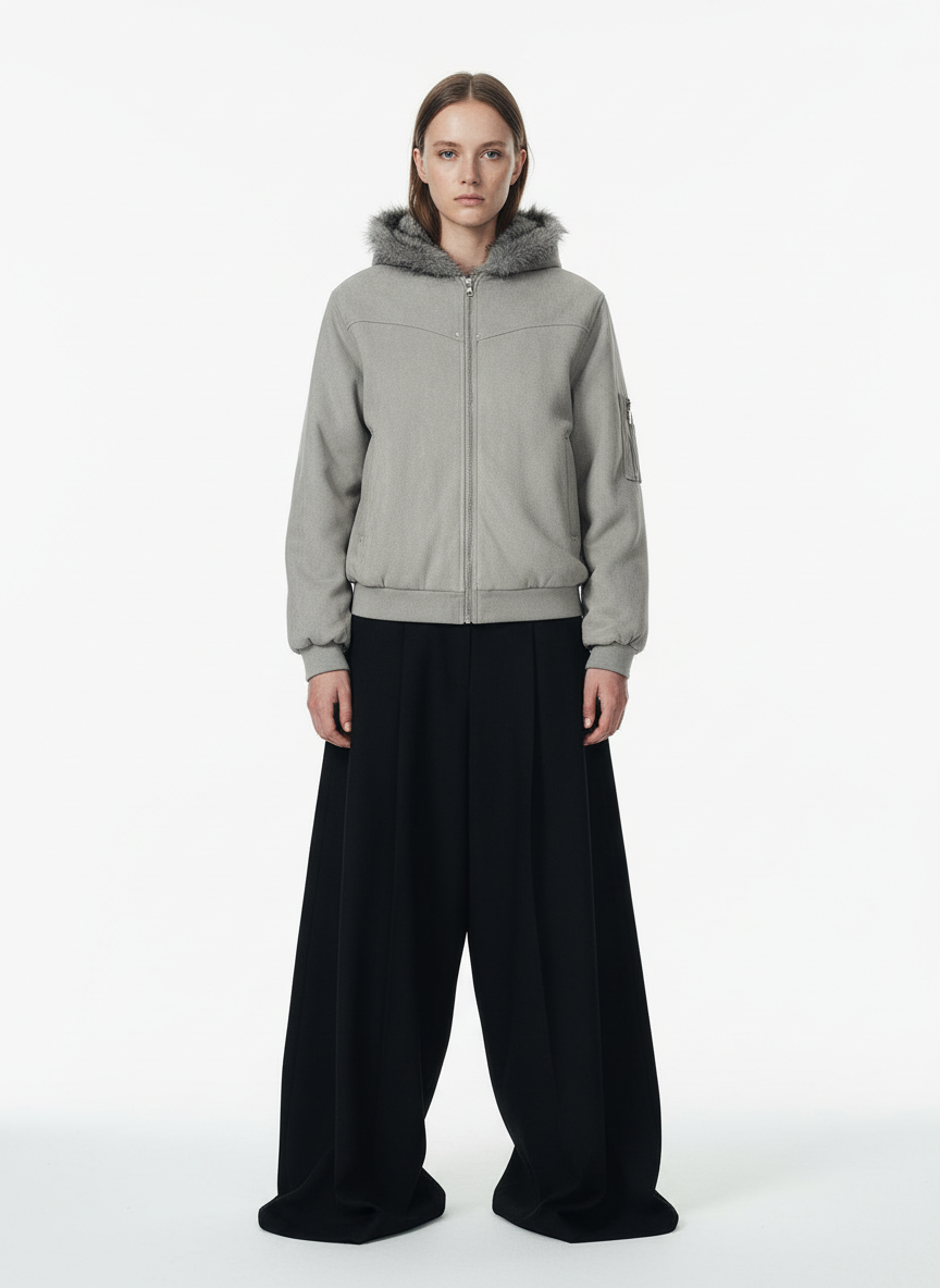 • Design Elements: Detachable hood, front zipper closure, ribbed cuffs