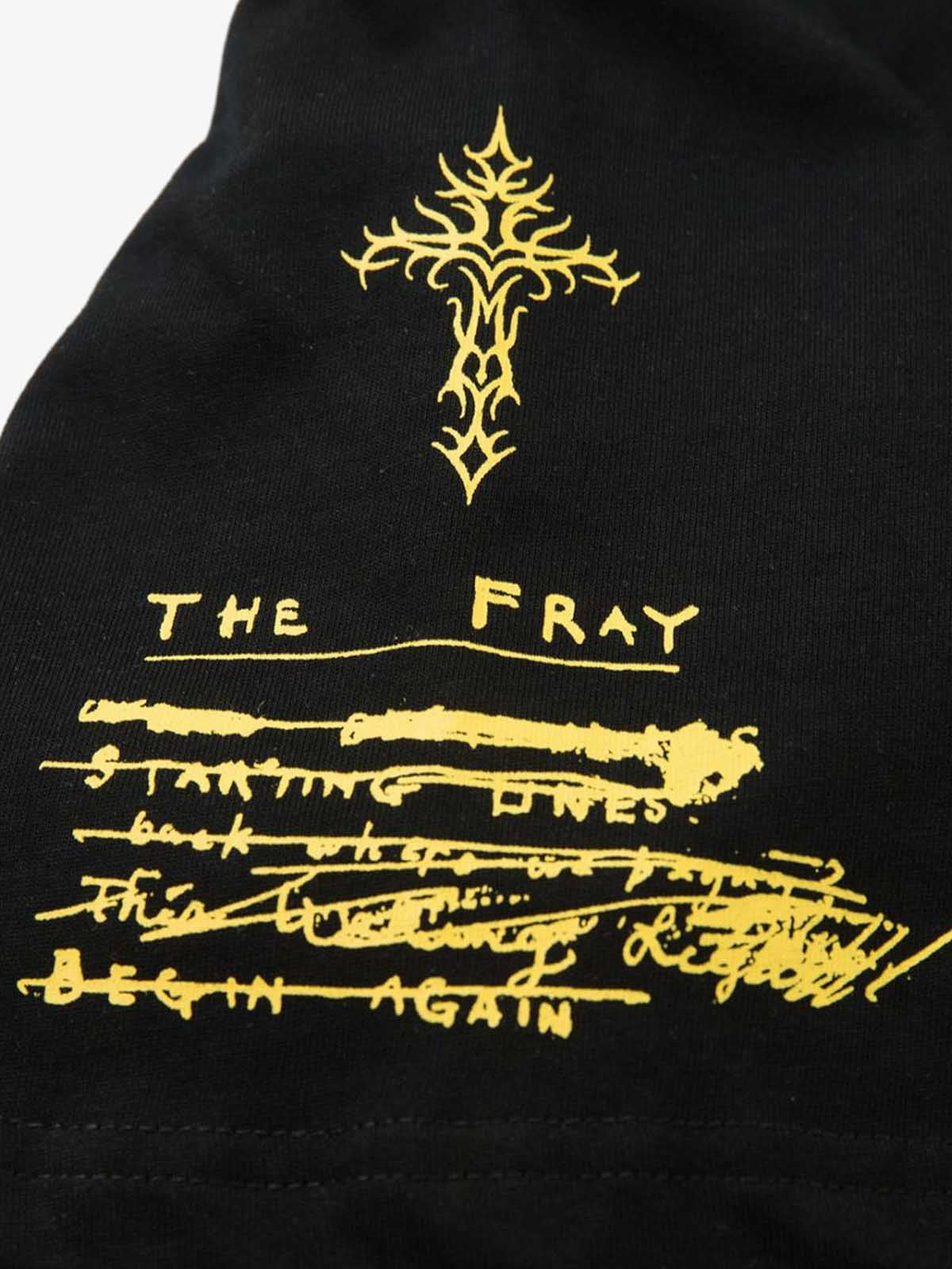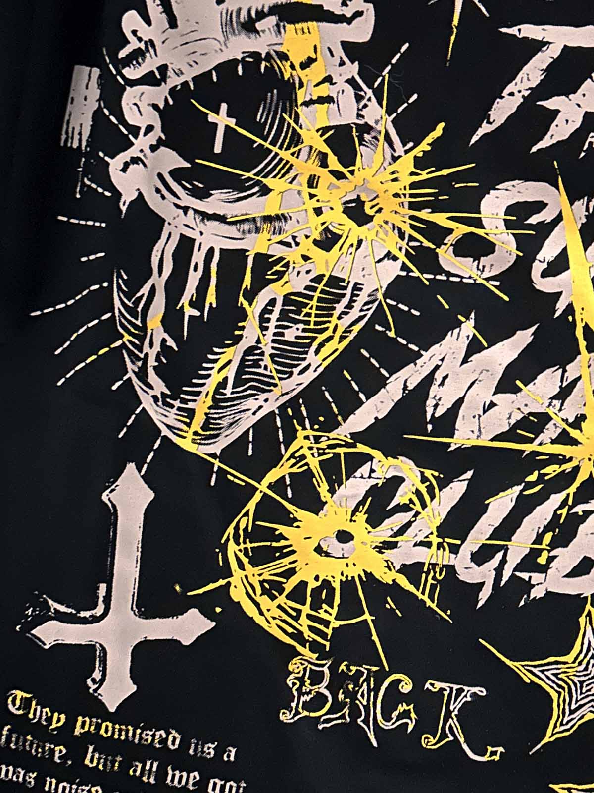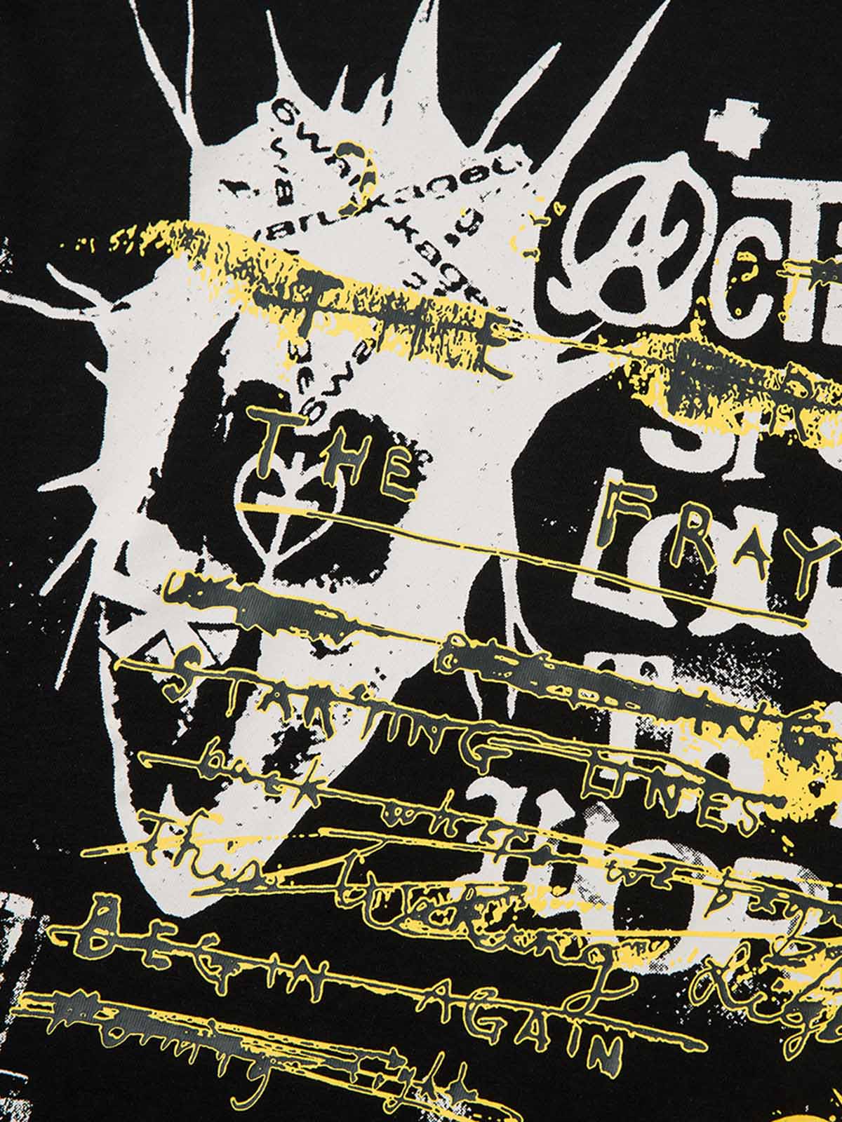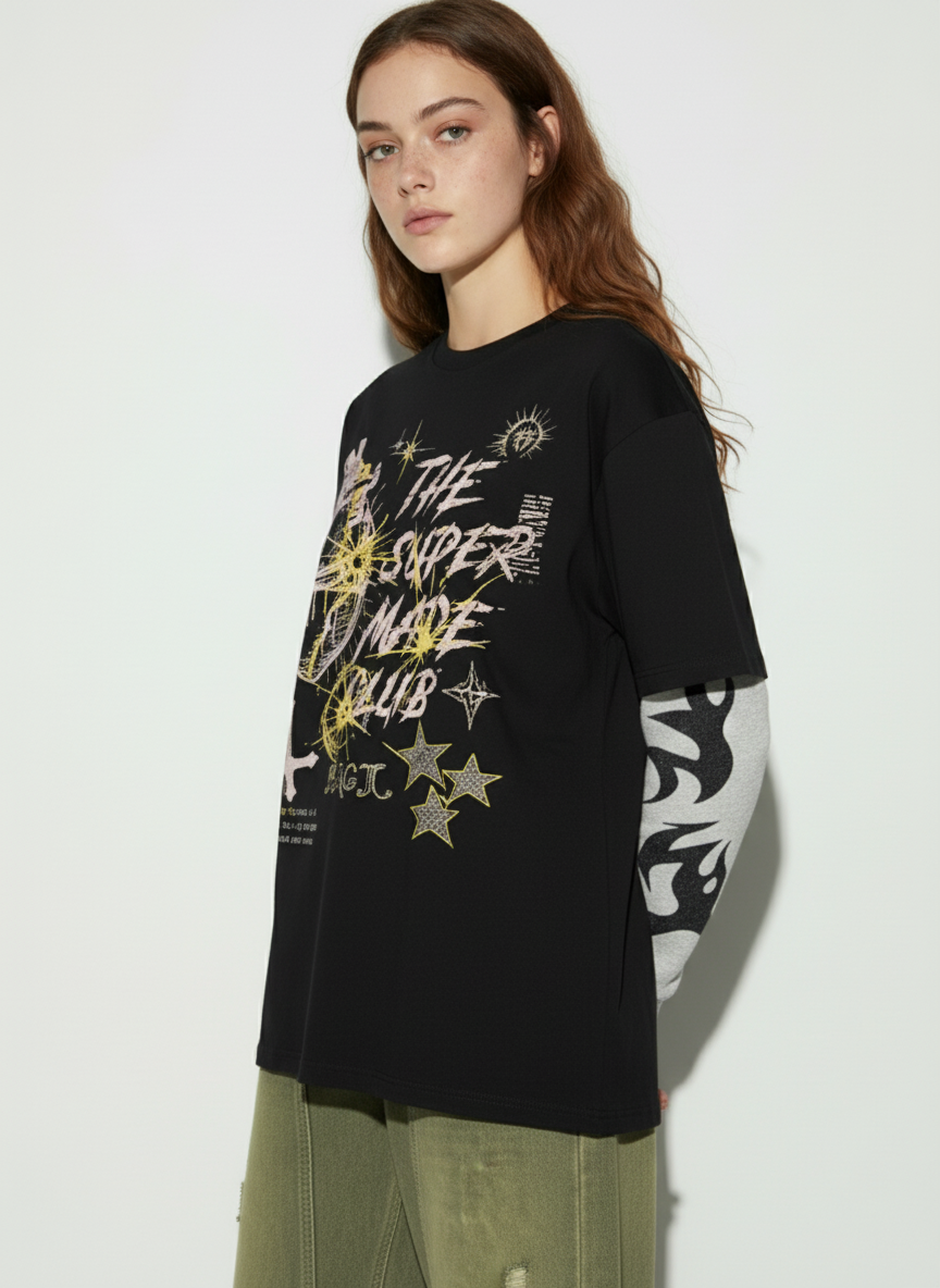 • Design Elements: Distressed graphic print, layered sleeve design, bold typography
